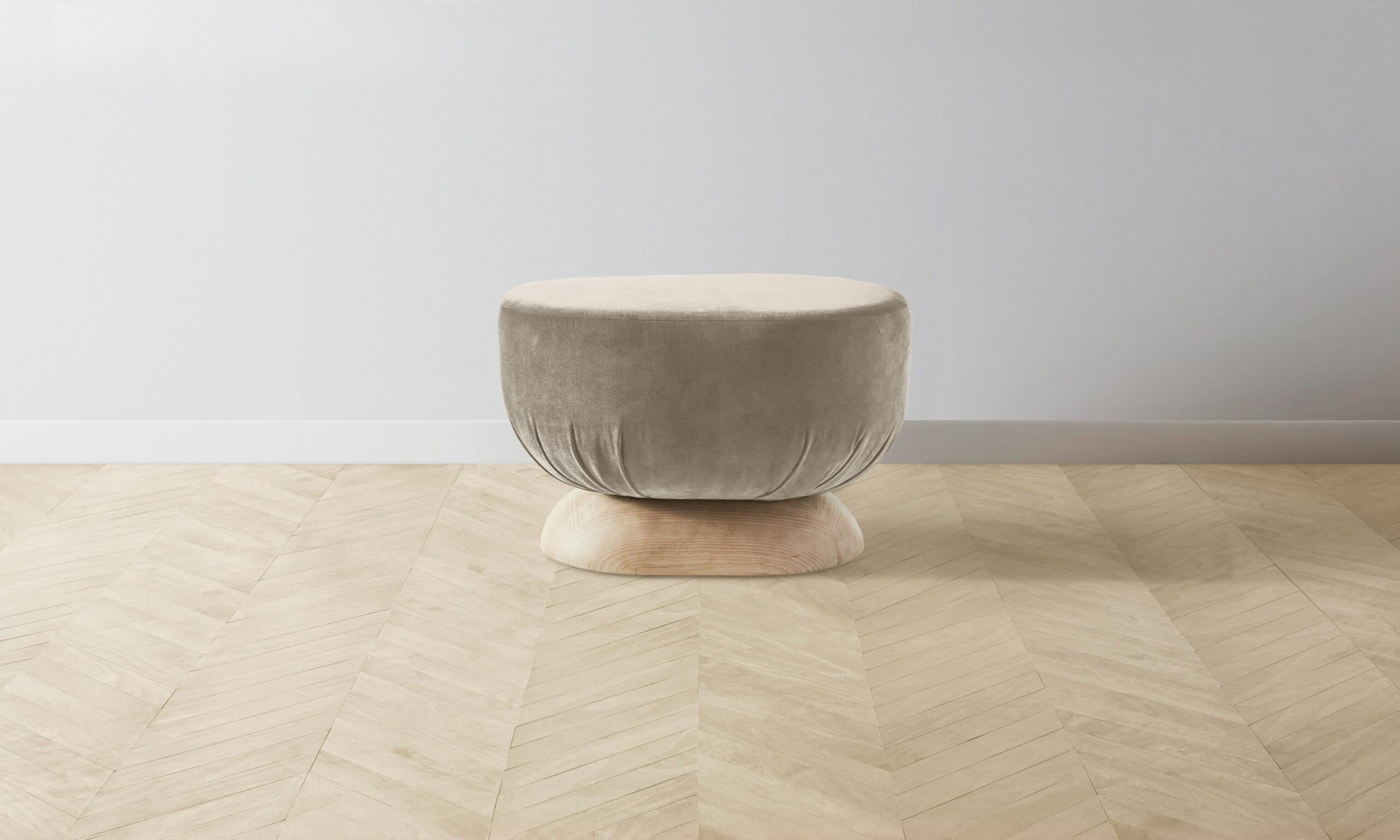 Characterized by its distinctive sculptural shape, the Mott stool is traced with smooth curves on all sides. It has a masterfully upholstered seat and sits atop an ash base.