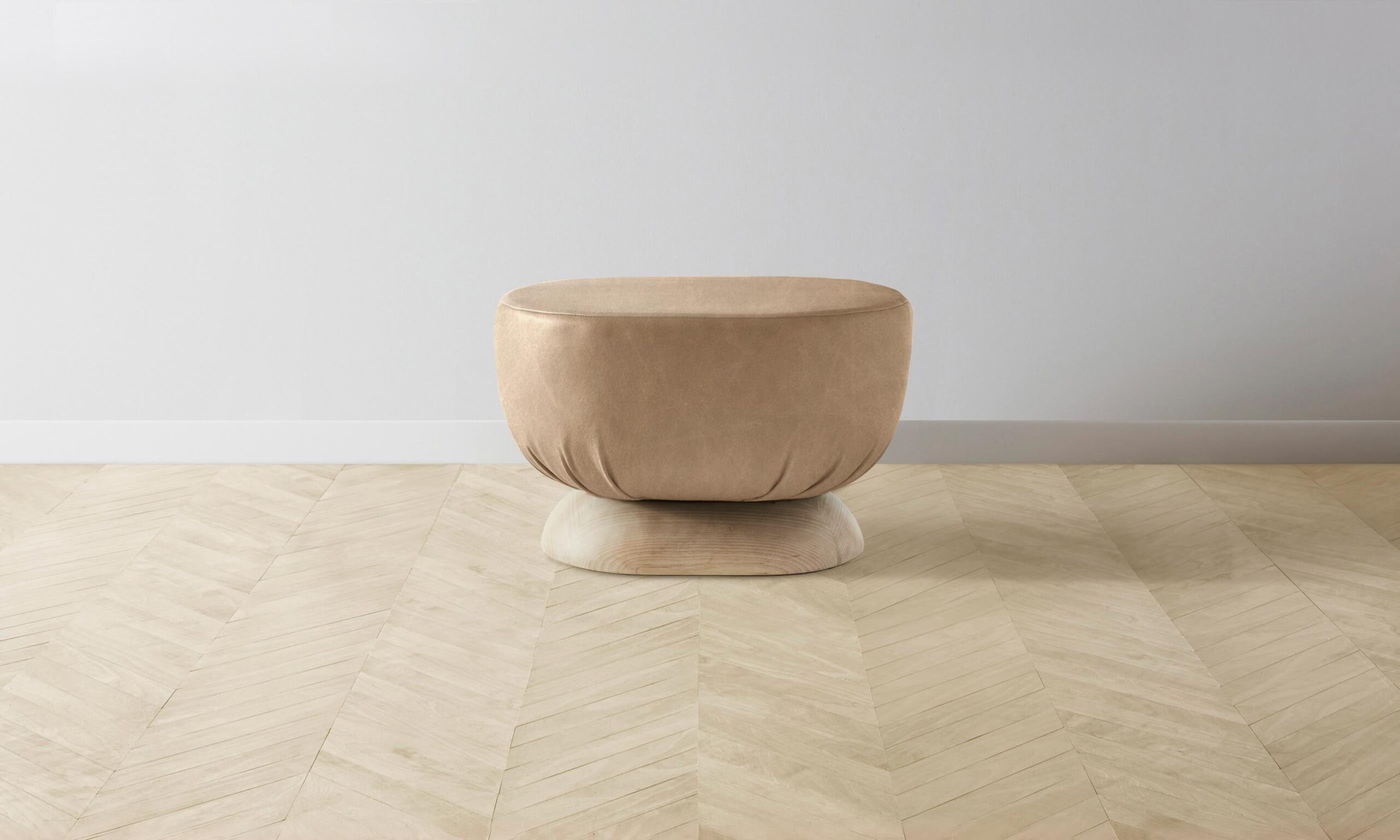 Characterized by its distinctive sculptural shape, the Mott stool is traced with smooth curves on all sides. It has a masterfully upholstered seat and sits atop an ash base.