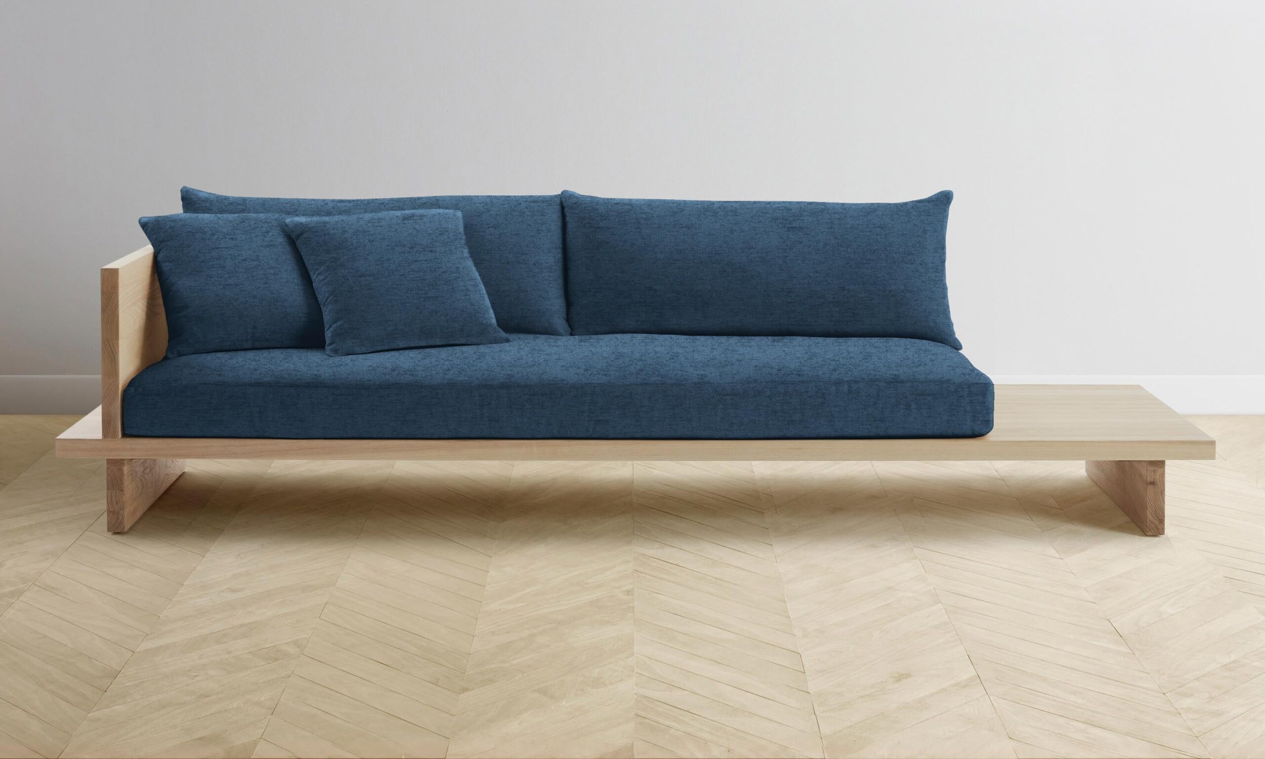 From the woodwork to the tailoring, every element of the Muir sofa is a display of exquisite artisanship. Its angular frame extends beyond the seat cushion, allowing space for decorative objects or necessities.