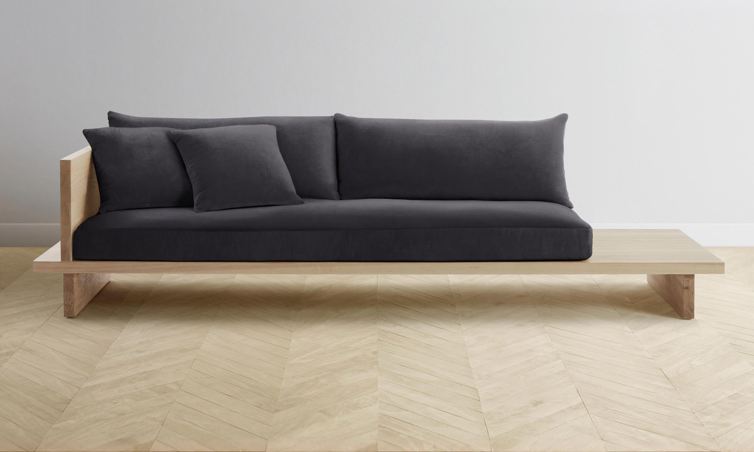 From the woodwork to the tailoring, every element of the Muir sofa is a display of exquisite artisanship. Its angular frame extends beyond the seat cushion, allowing space for decorative objects or necessities.