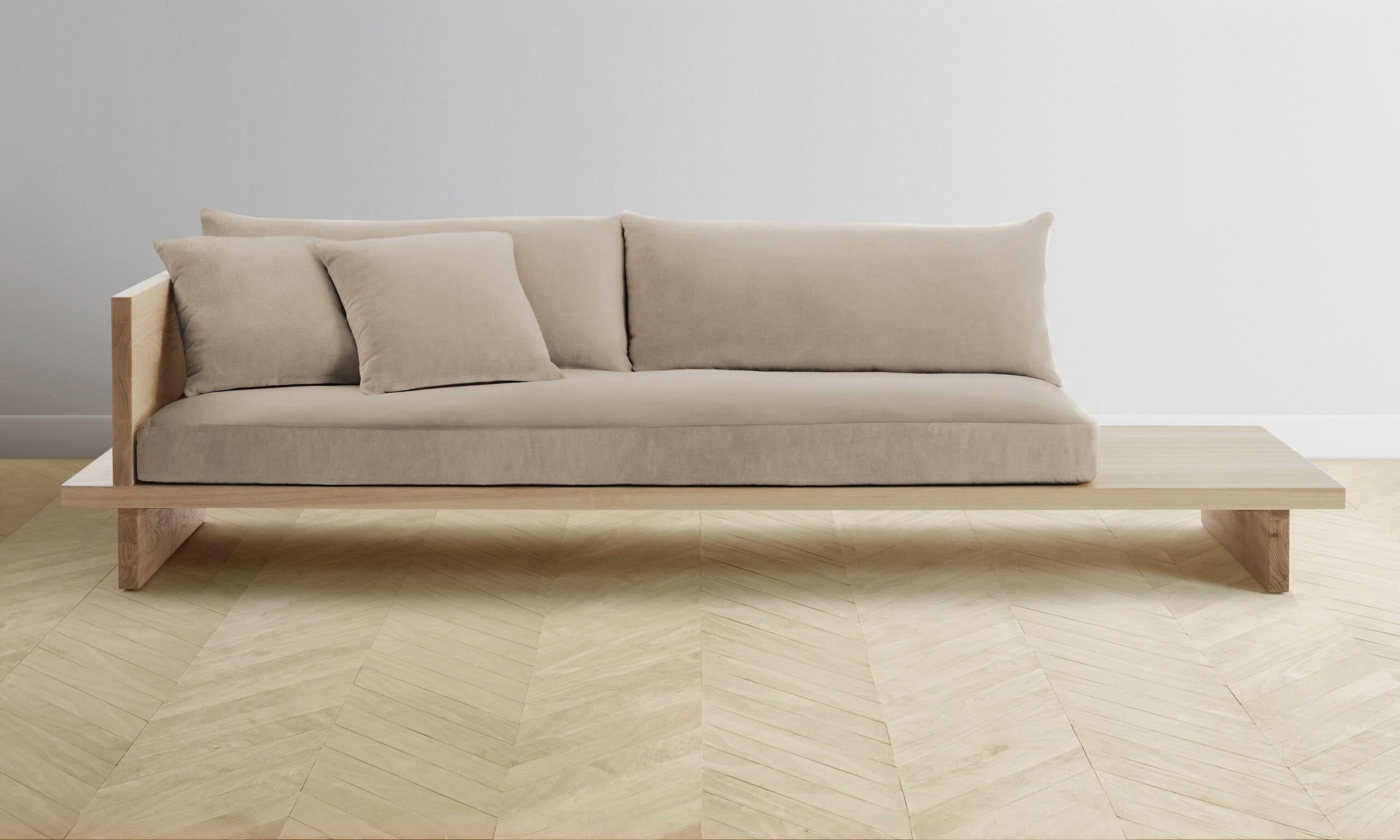 From the woodwork to the tailoring, every element of the Muir sofa is a display of exquisite artisanship. Its angular frame extends beyond the seat cushion, allowing space for decorative objects or necessities.