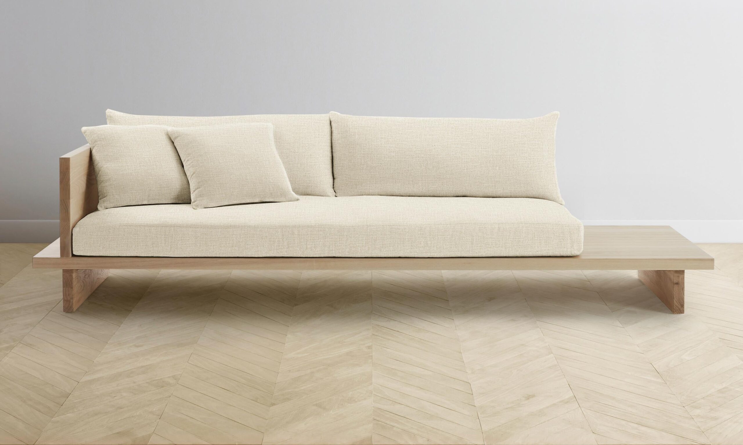 From the woodwork to the tailoring, every element of the Muir sofa is a display of exquisite artisanship. Its angular frame extends beyond the seat cushion, allowing space for decorative objects or necessities.