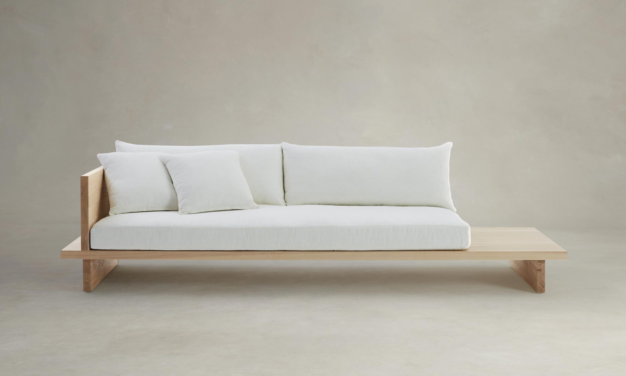 From the woodwork to the tailoring, every element of the Muir sofa is a display of exquisite artisanship. Its angular frame extends beyond the seat cushion, allowing space for decorative objects or necessities.