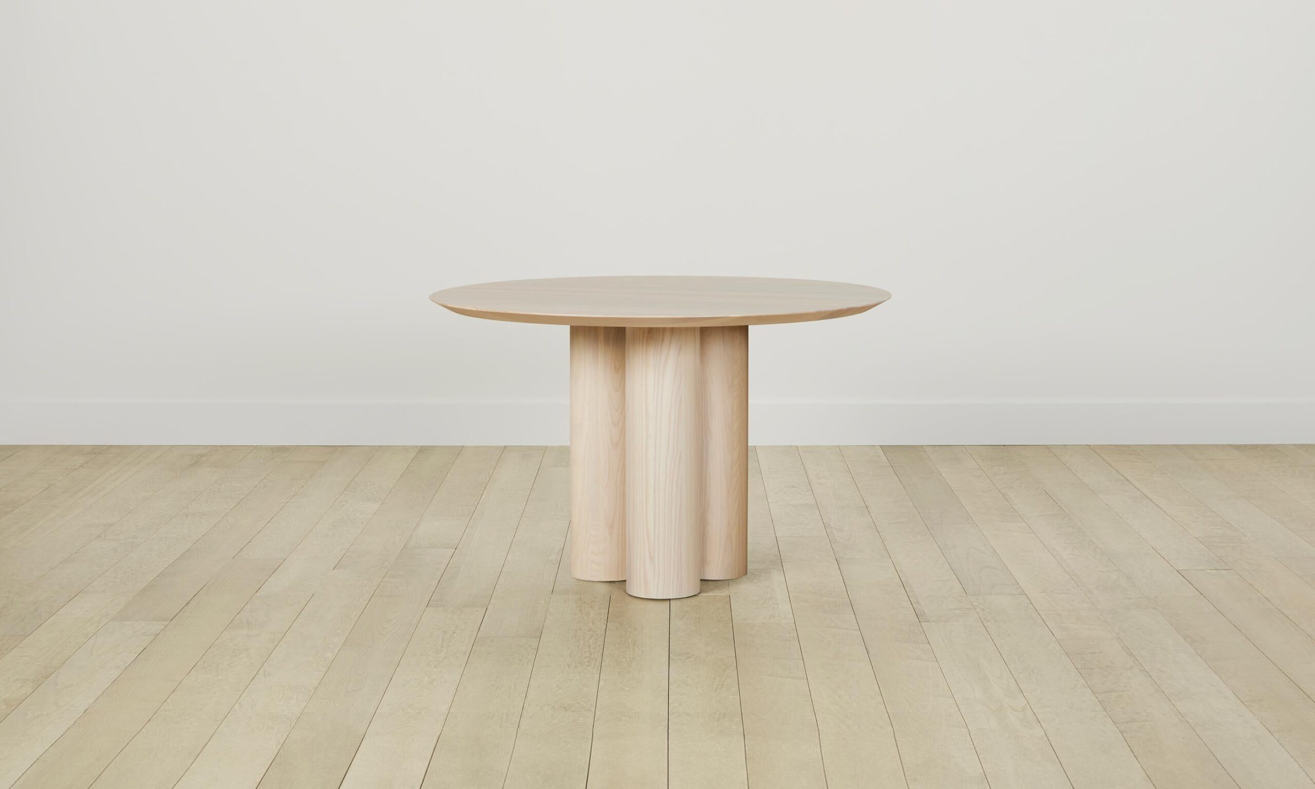 In the Reade round dining table, strong and sculptural forms collide. The design features a circular tabletop and columnar legs, each shaped from solid ash.