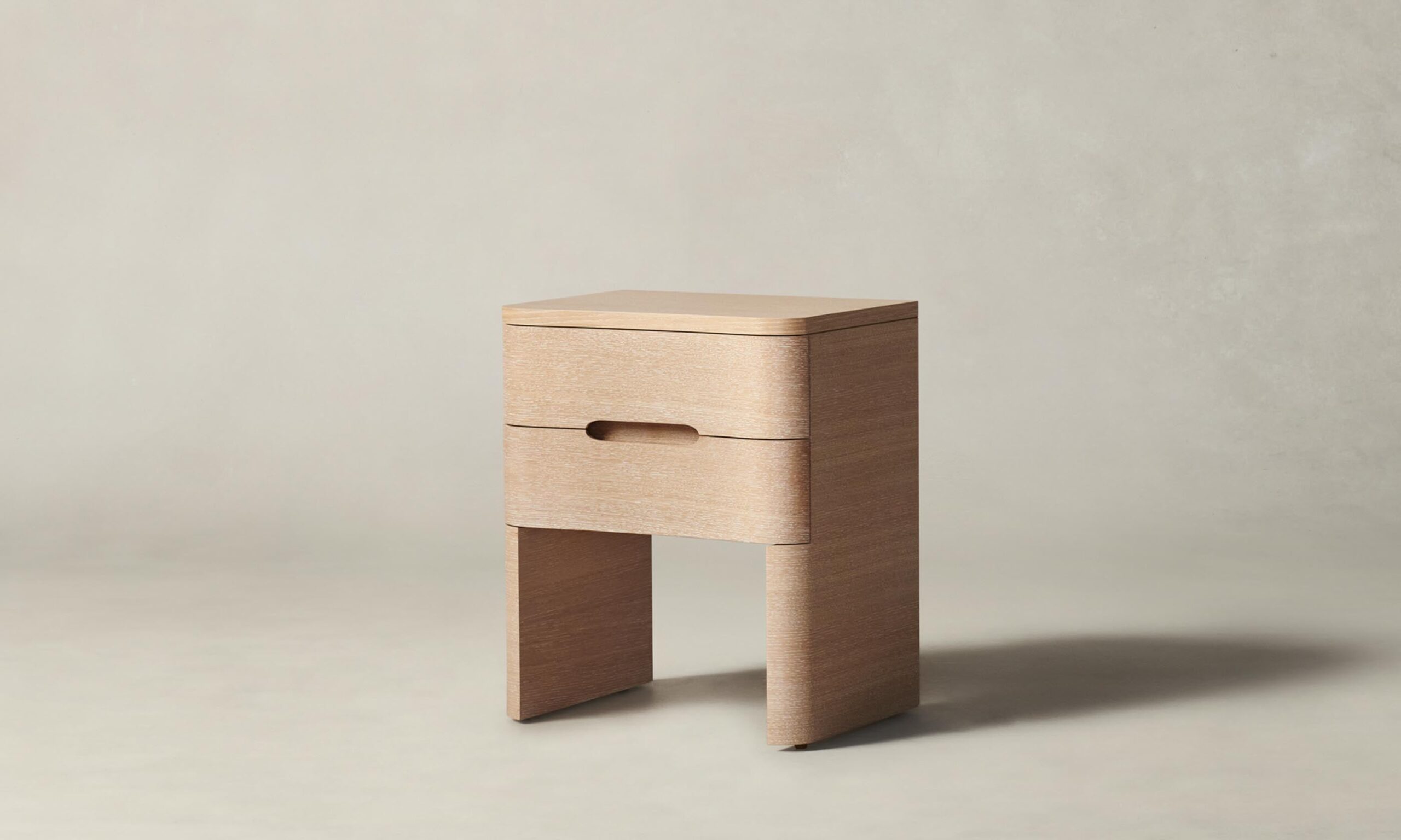 The Rivington petite 2-drawer nightstand pays tribute to postmodernism with its liquid curves and contours. The design is enveloped in cerused white oak veneer that underscores the softness of the silhouette.