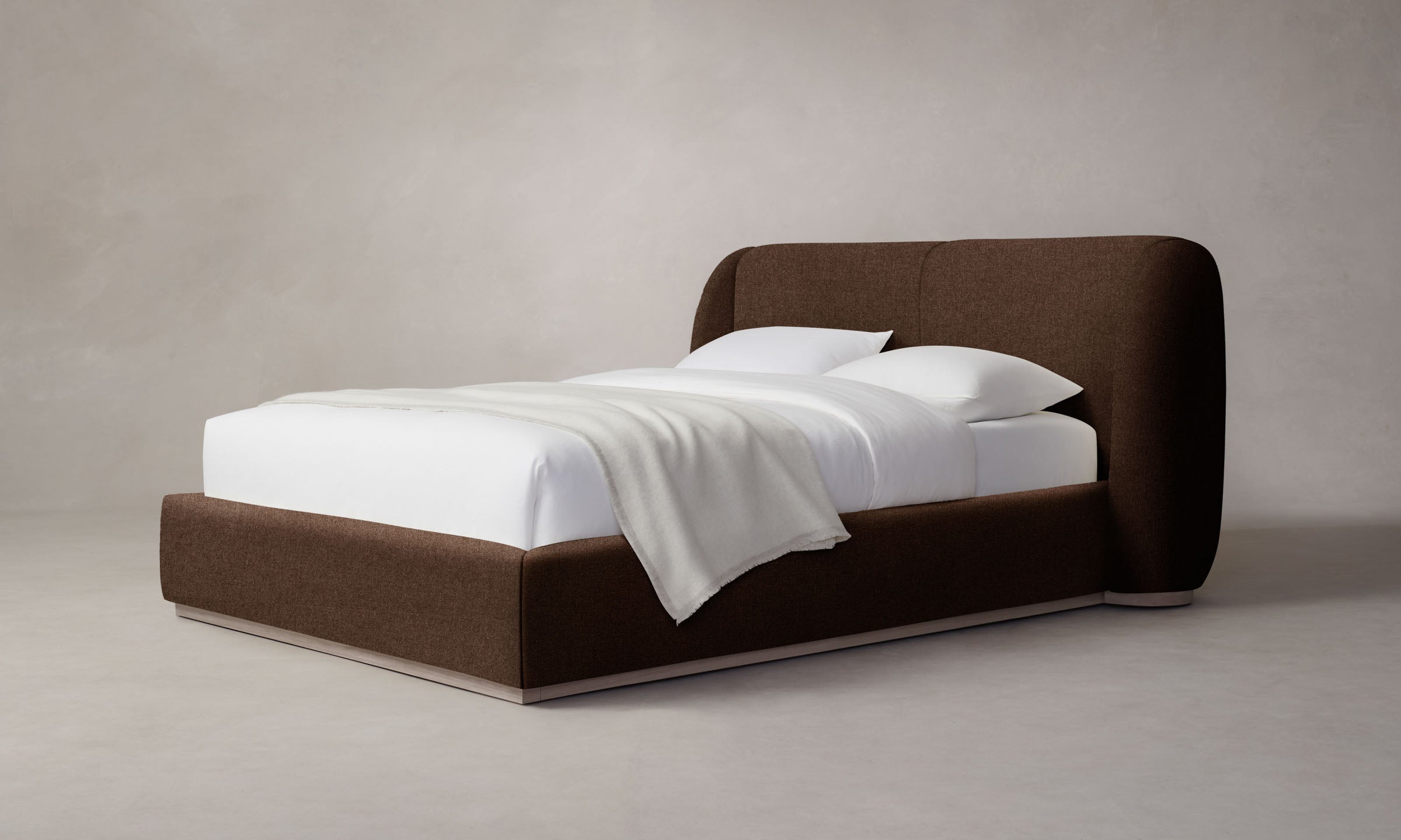With its voluminous form and sweeping curves, the Smith bed is a statement piece for the bedroom. Its enveloping shelter headboard and frame are fully upholstered and set upon a plinth base.