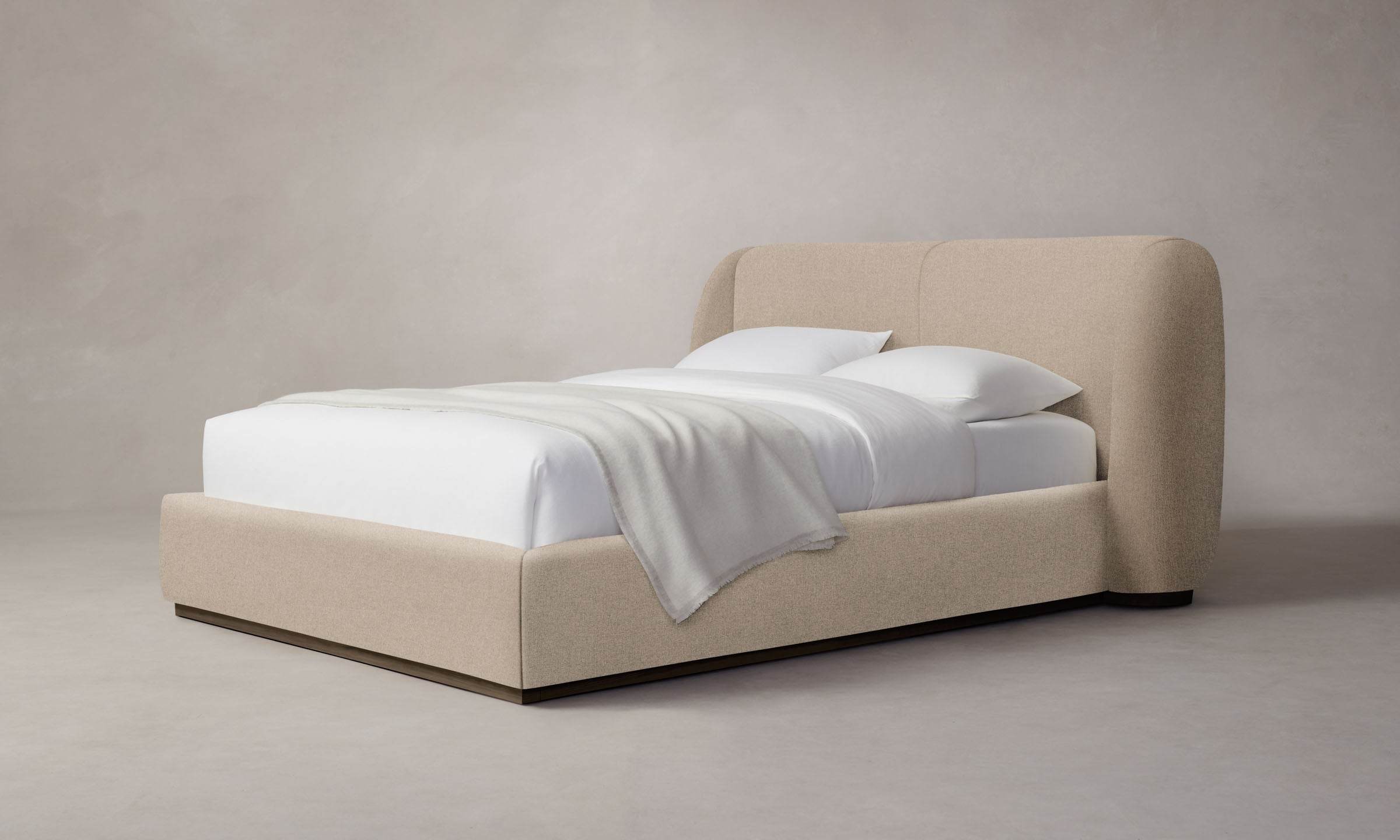 With its voluminous form and sweeping curves, the Smith bed is a statement piece for the bedroom. Its enveloping shelter headboard and frame are fully upholstered and set upon a plinth base.
