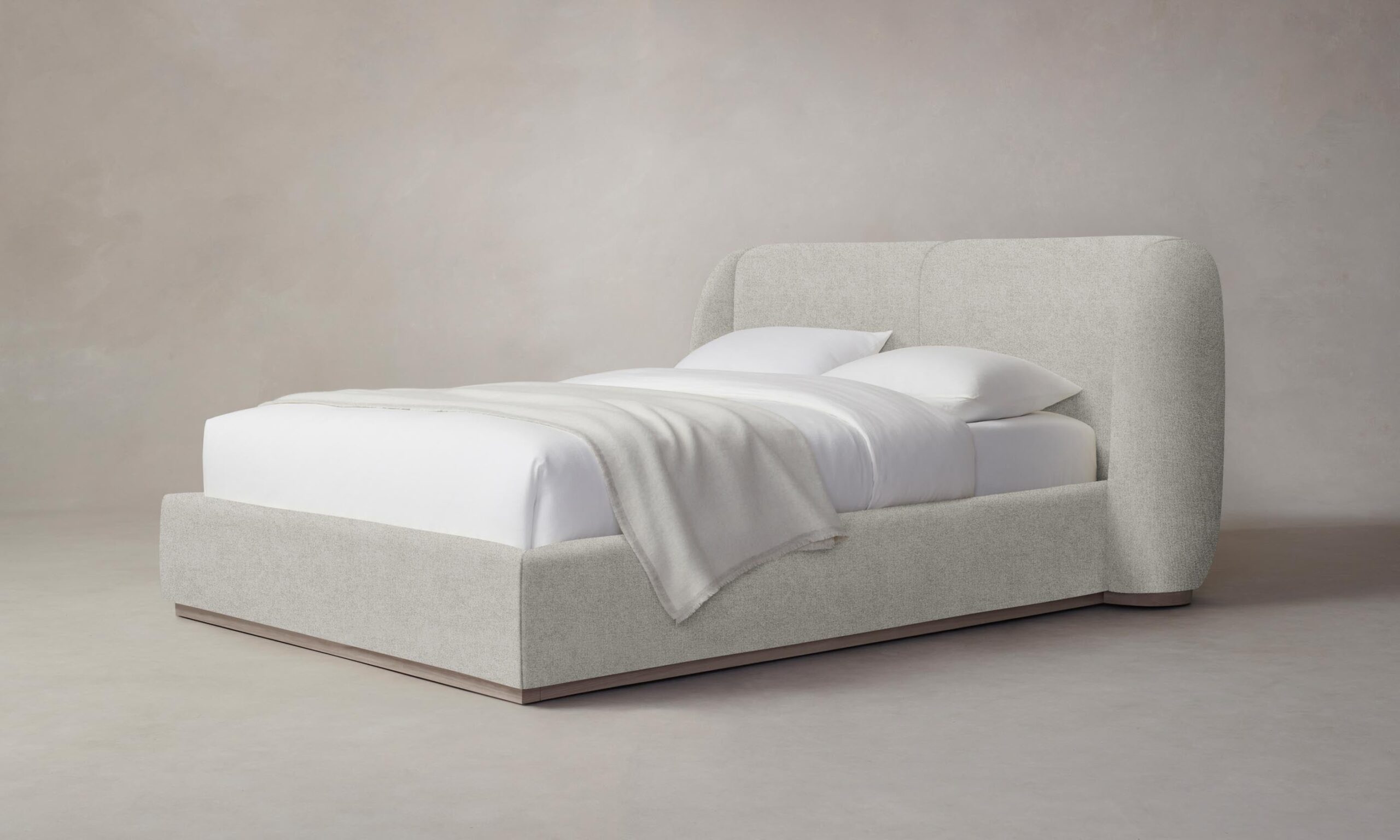 With its voluminous form and sweeping curves, the Smith bed is a statement piece for the bedroom. Its enveloping shelter headboard and frame are fully upholstered and set upon a plinth base.