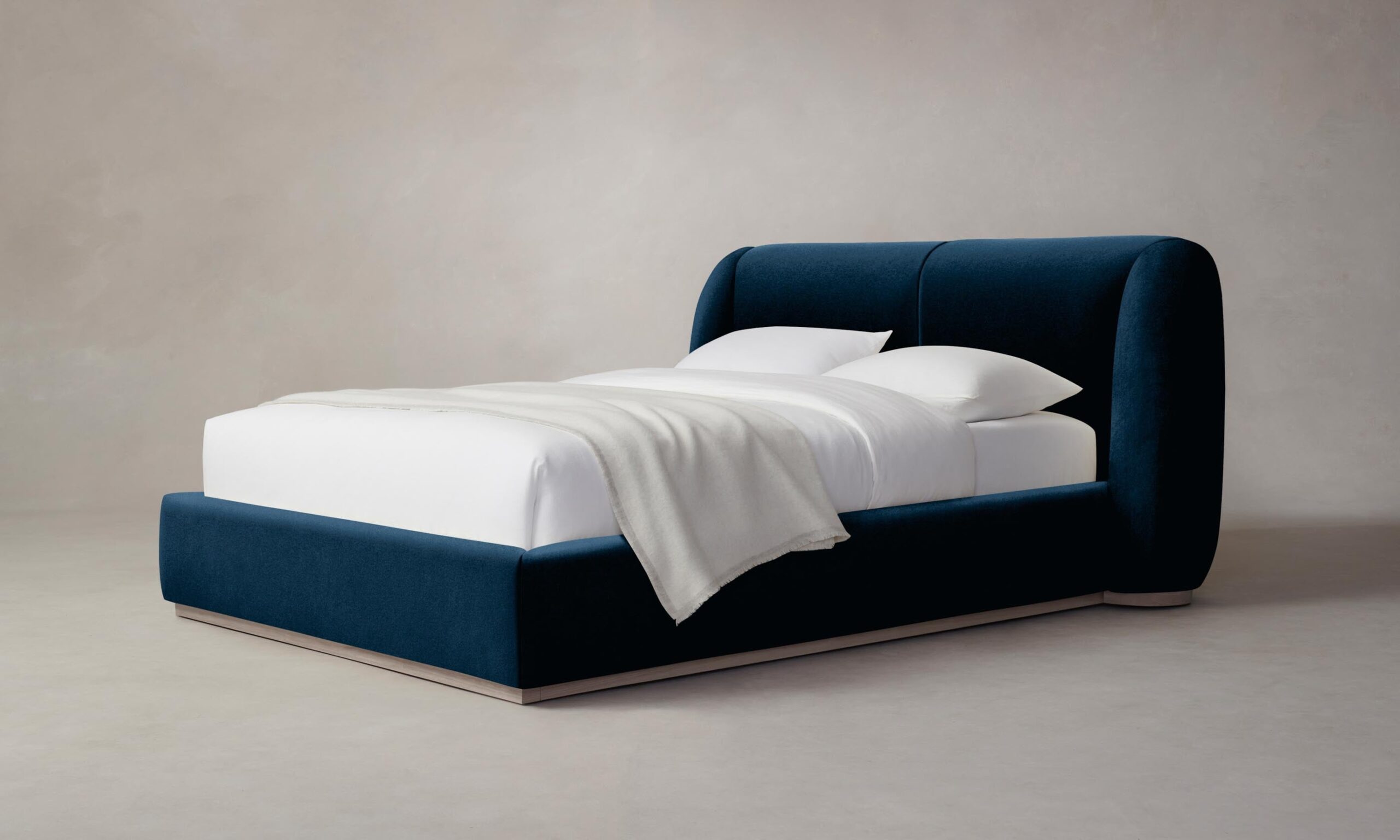 With its voluminous form and sweeping curves, the Smith bed is a statement piece for the bedroom. Its enveloping shelter headboard and frame are fully upholstered and set upon a plinth base.