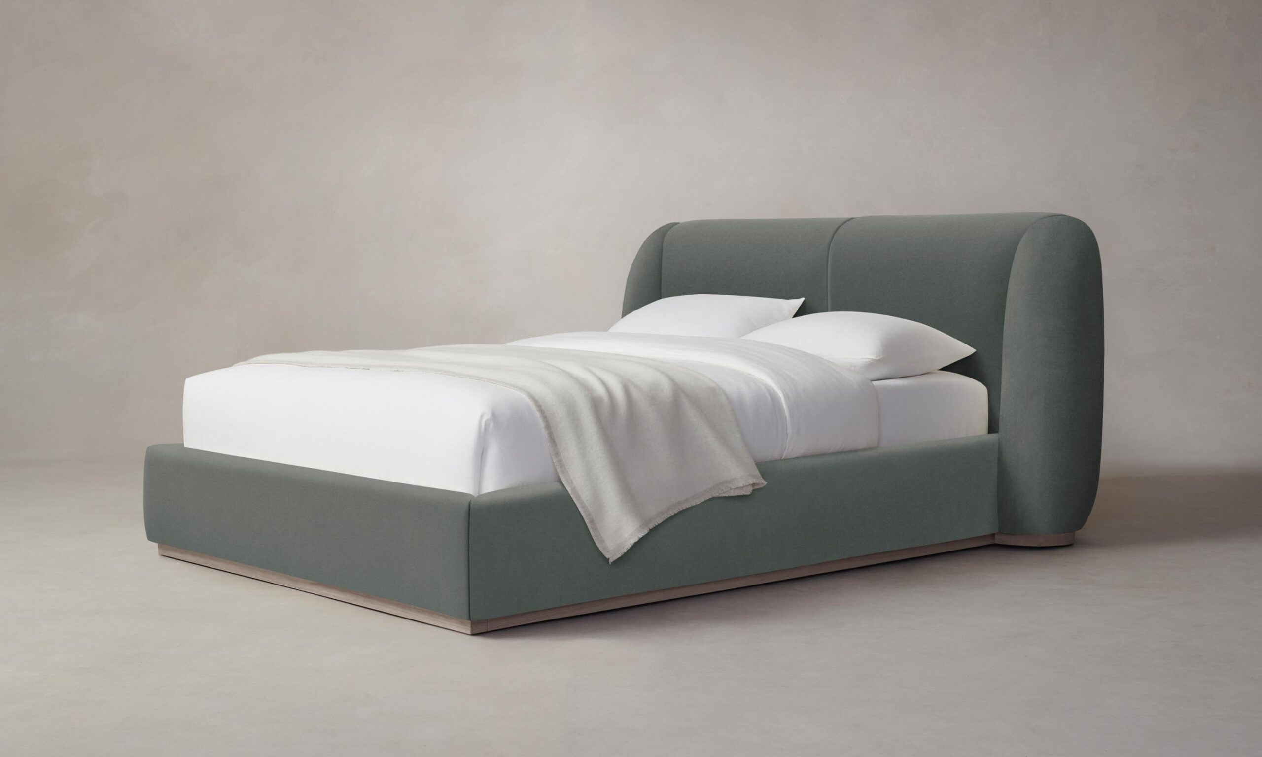 With its voluminous form and sweeping curves, the Smith bed is a statement piece for the bedroom. Its enveloping shelter headboard and frame are fully upholstered and set upon a plinth base.