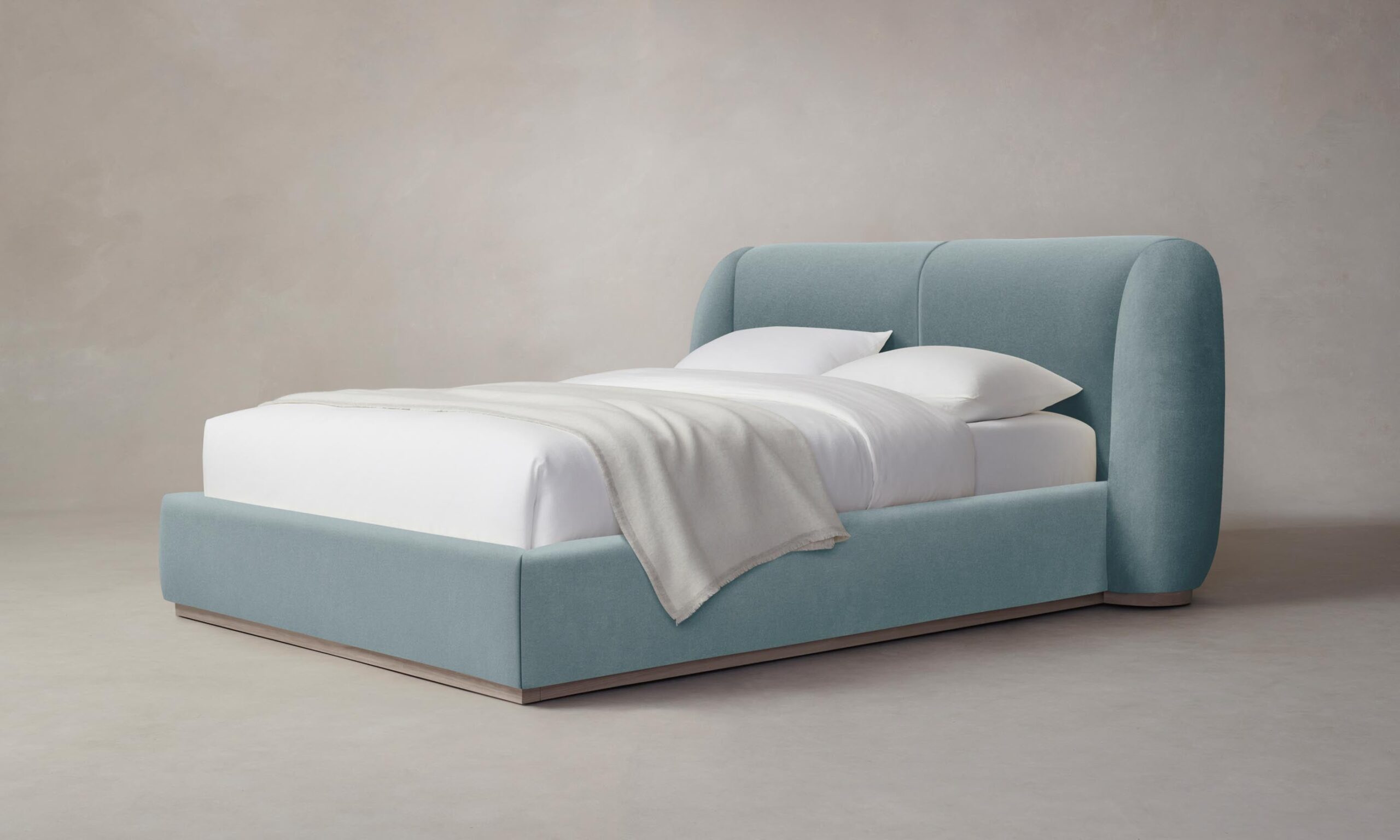With its voluminous form and sweeping curves, the Smith bed is a statement piece for the bedroom. Its enveloping shelter headboard and frame are fully upholstered and set upon a plinth base.