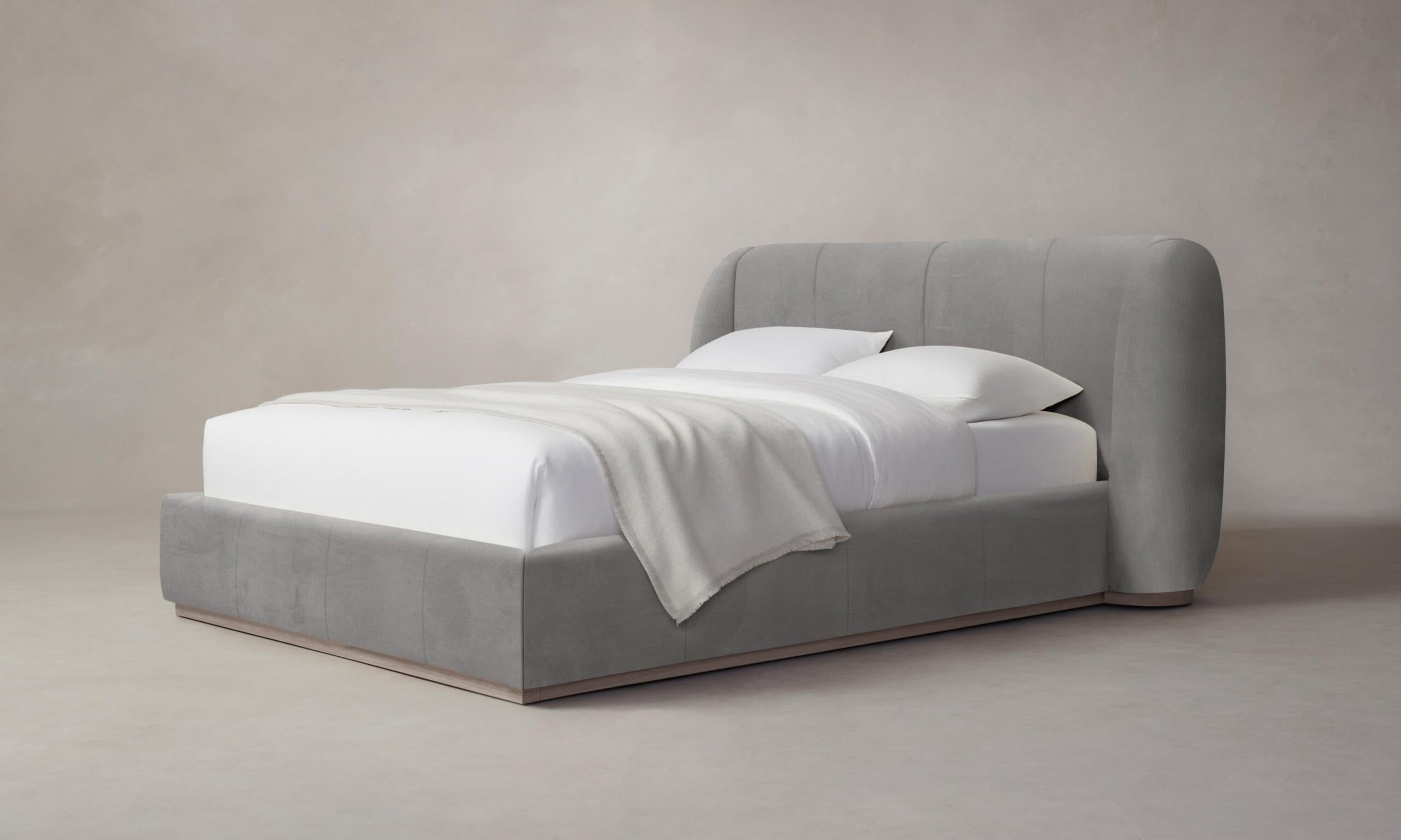 With its voluminous form and sweeping curves, the Smith bed is a statement piece for the bedroom. Its enveloping shelter headboard and frame are fully upholstered and set upon a plinth base.