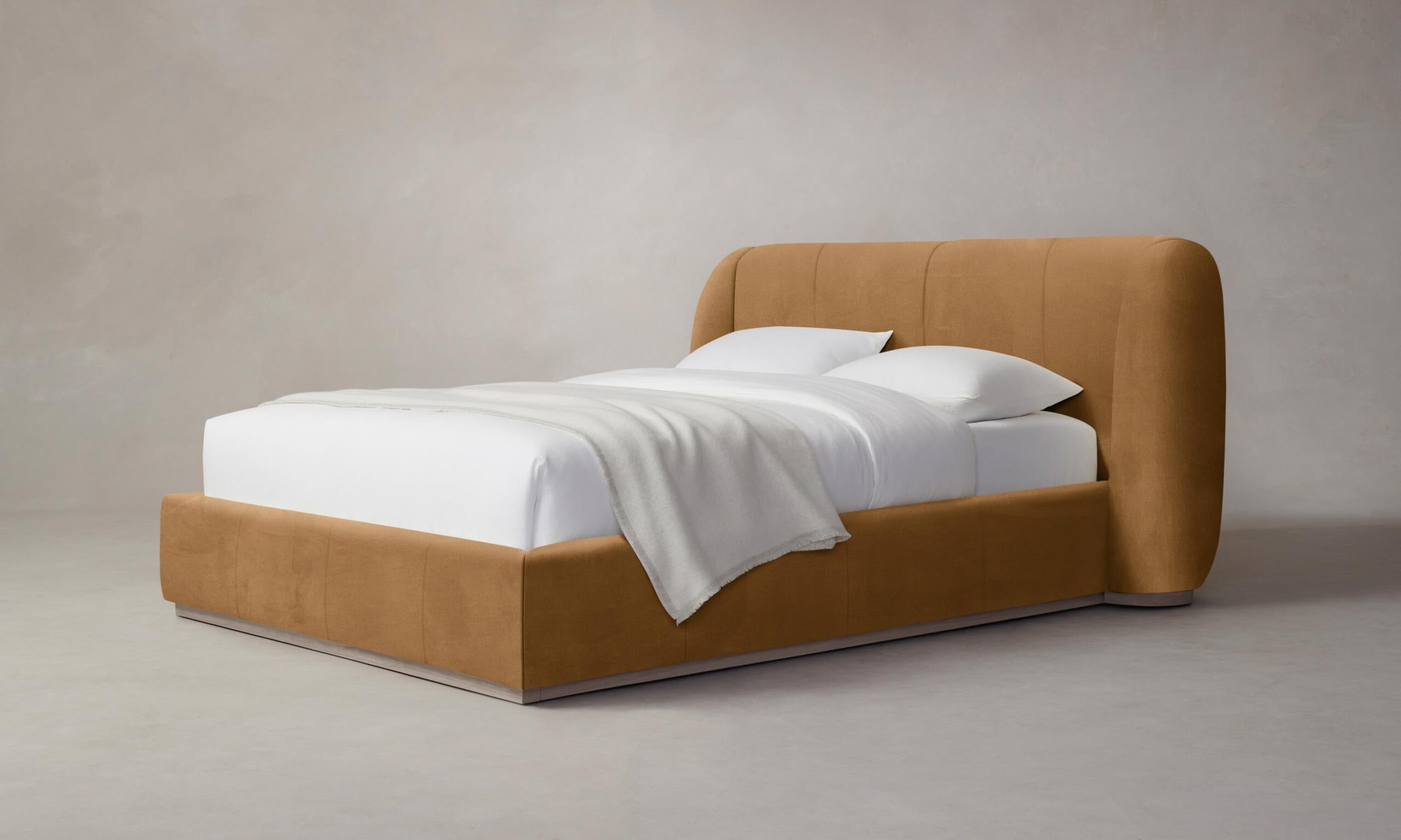 With its voluminous form and sweeping curves, the Smith bed is a statement piece for the bedroom. Its enveloping shelter headboard and frame are fully upholstered and set upon a plinth base.