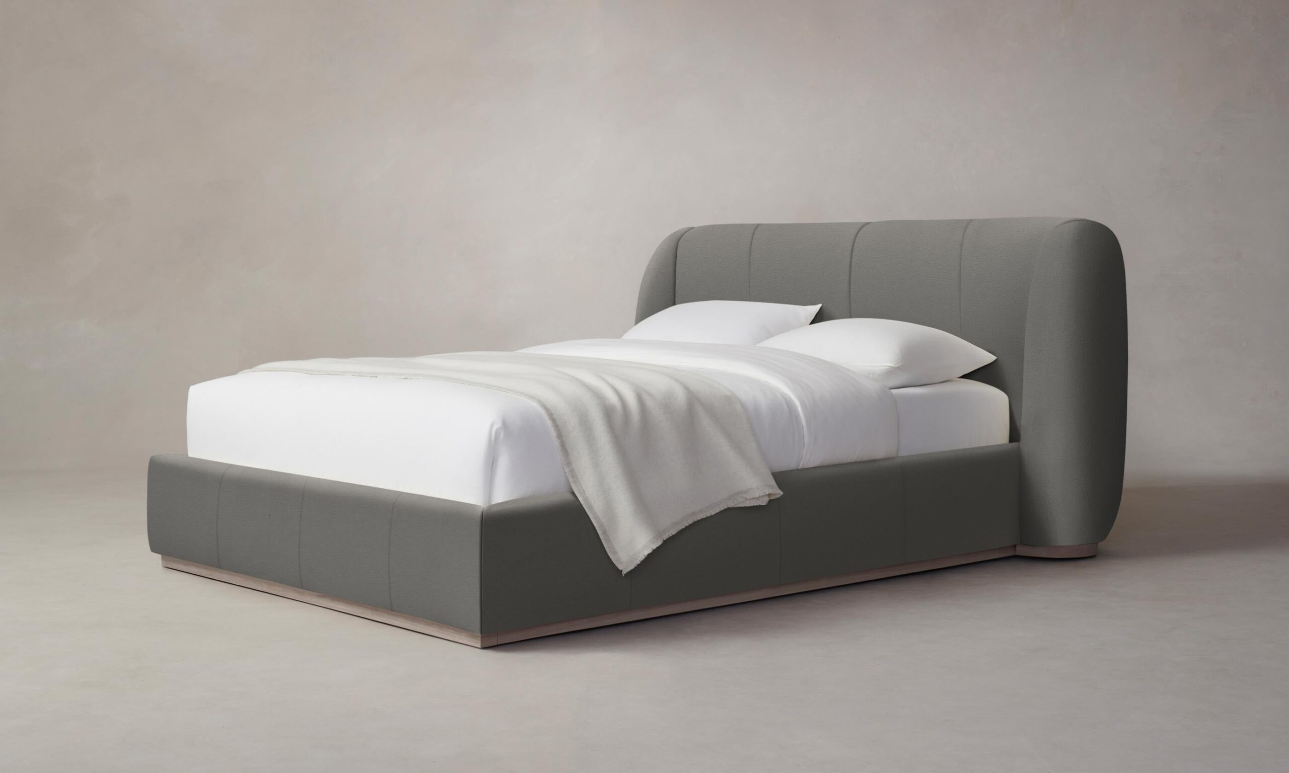 With its voluminous form and sweeping curves, the Smith bed is a statement piece for the bedroom. Its enveloping shelter headboard and frame are fully upholstered and set upon a plinth base.