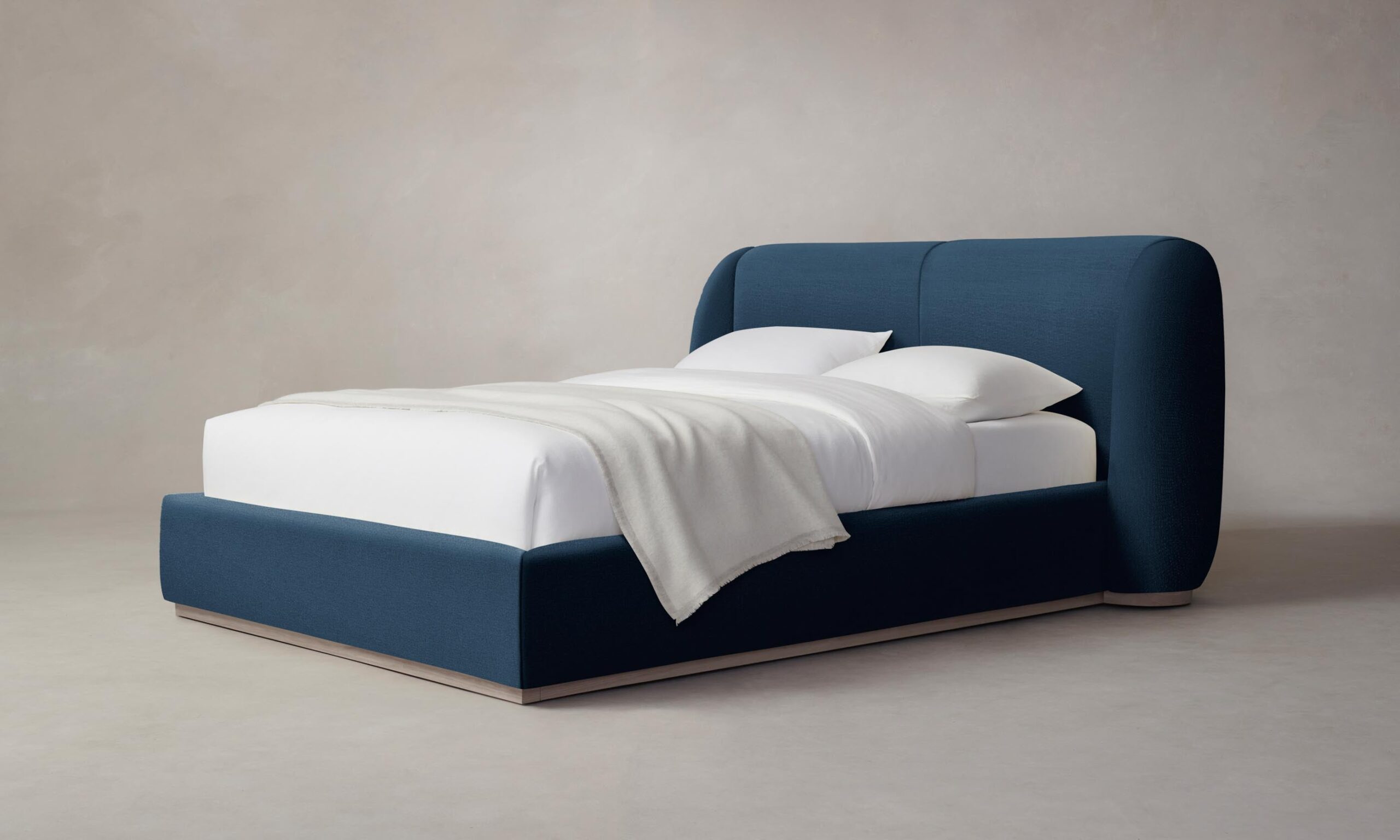 With its voluminous form and sweeping curves, the Smith bed is a statement piece for the bedroom. Its enveloping shelter headboard and frame are fully upholstered and set upon a plinth base.