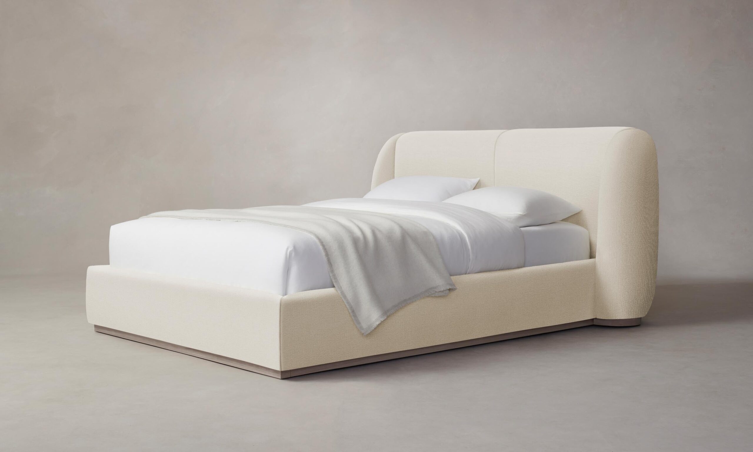 With its voluminous form and sweeping curves, the Smith bed is a statement piece for the bedroom. Its enveloping shelter headboard and frame are fully upholstered and set upon a plinth base.