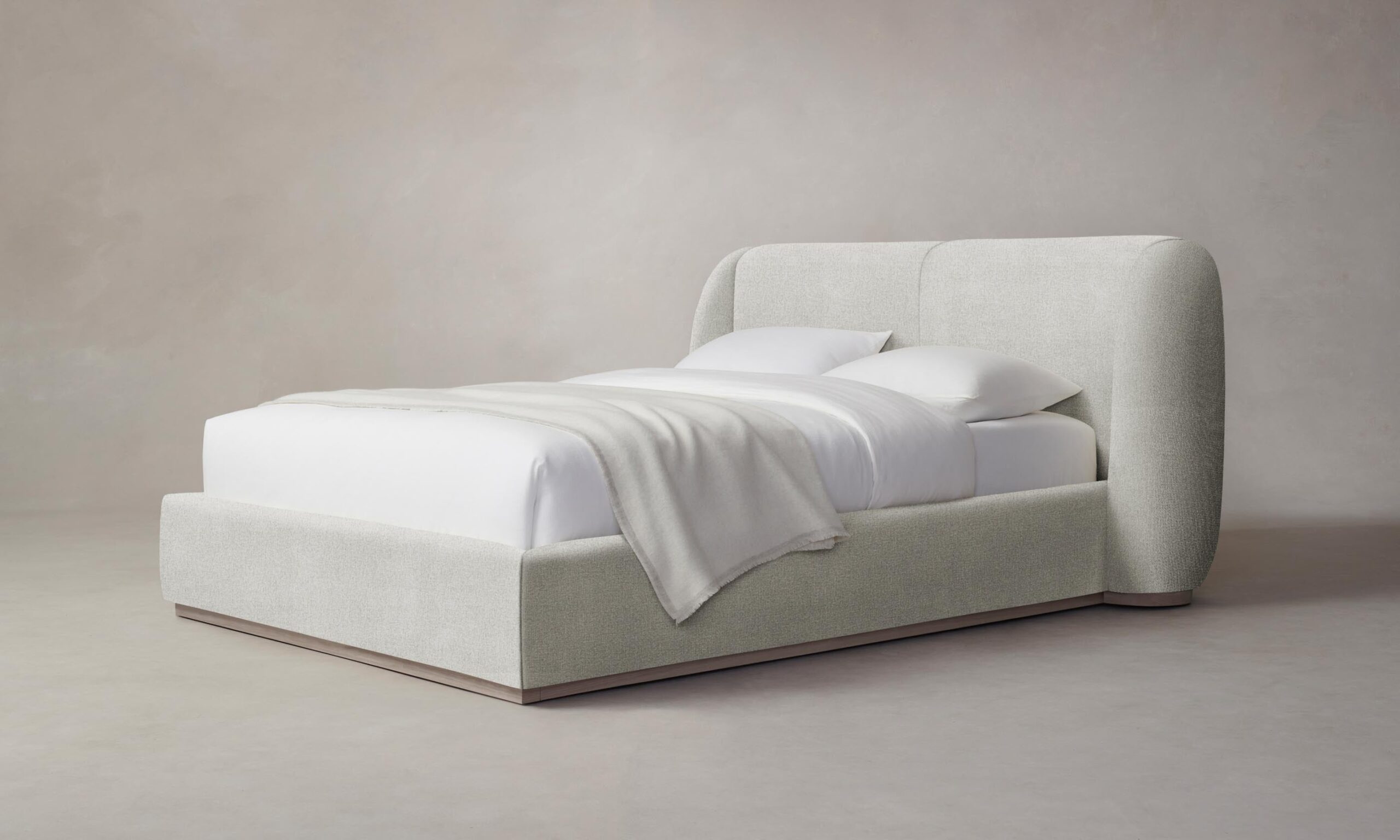 With its voluminous form and sweeping curves, the Smith bed is a statement piece for the bedroom. Its enveloping shelter headboard and frame are fully upholstered and set upon a plinth base.