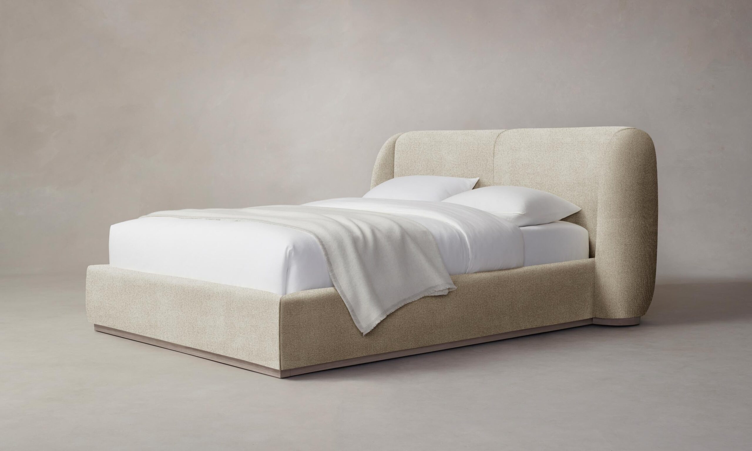 With its voluminous form and sweeping curves, the Smith bed is a statement piece for the bedroom. Its enveloping shelter headboard and frame are fully upholstered and set upon a plinth base.