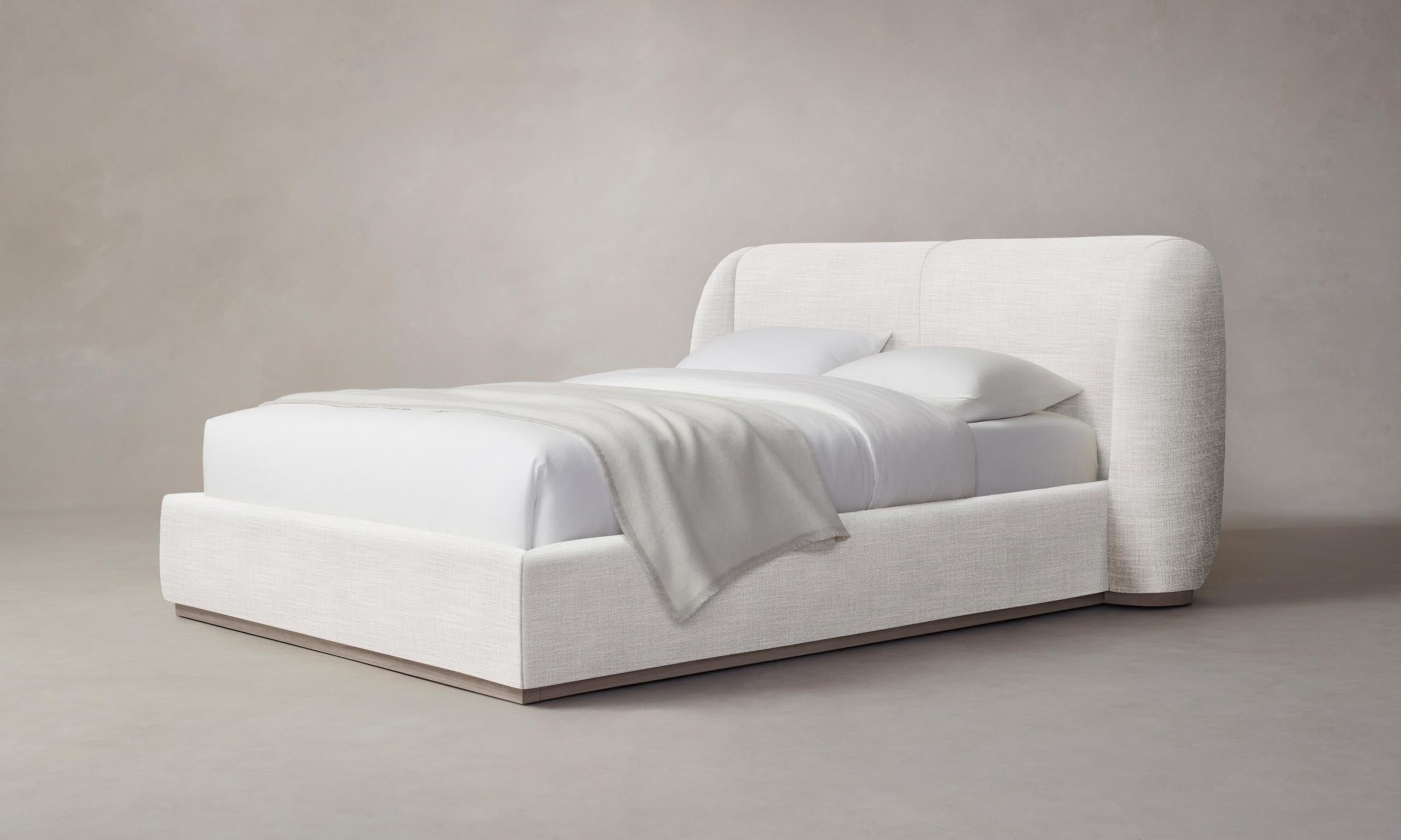 With its voluminous form and sweeping curves, the Smith bed is a statement piece for the bedroom. Its enveloping shelter headboard and frame are fully upholstered and set upon a plinth base.