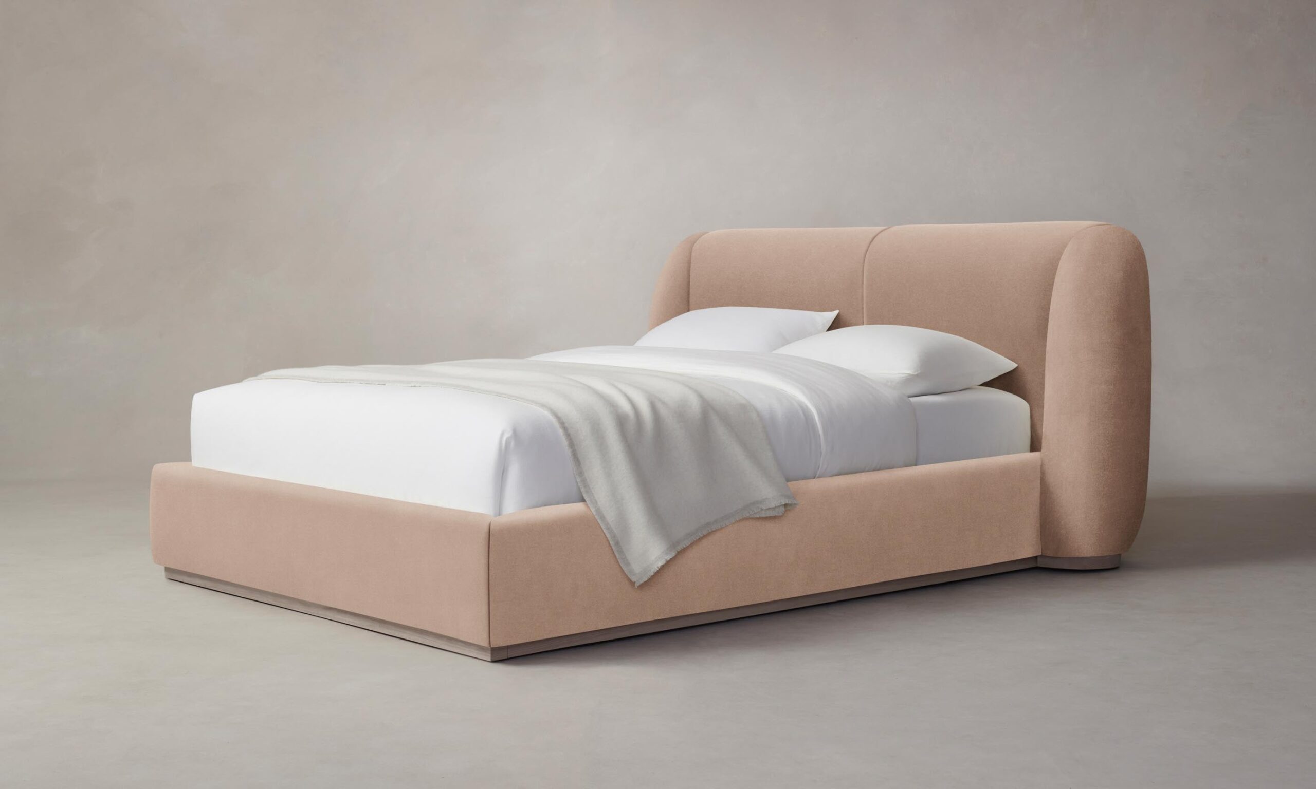 With its voluminous form and sweeping curves, the Smith bed is a statement piece for the bedroom. Its enveloping shelter headboard and frame are fully upholstered and set upon a plinth base.