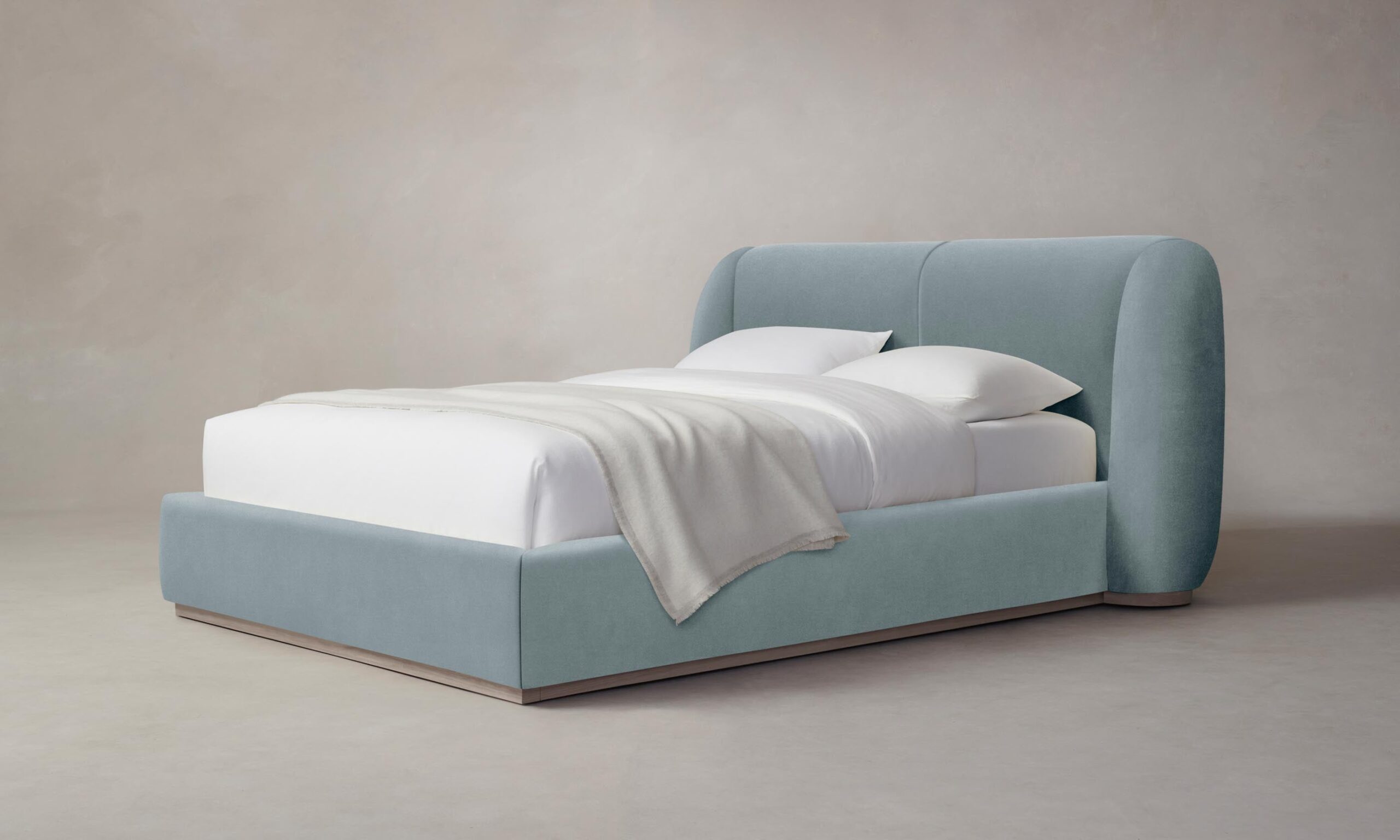 With its voluminous form and sweeping curves, the Smith bed is a statement piece for the bedroom. Its enveloping shelter headboard and frame are fully upholstered and set upon a plinth base.
