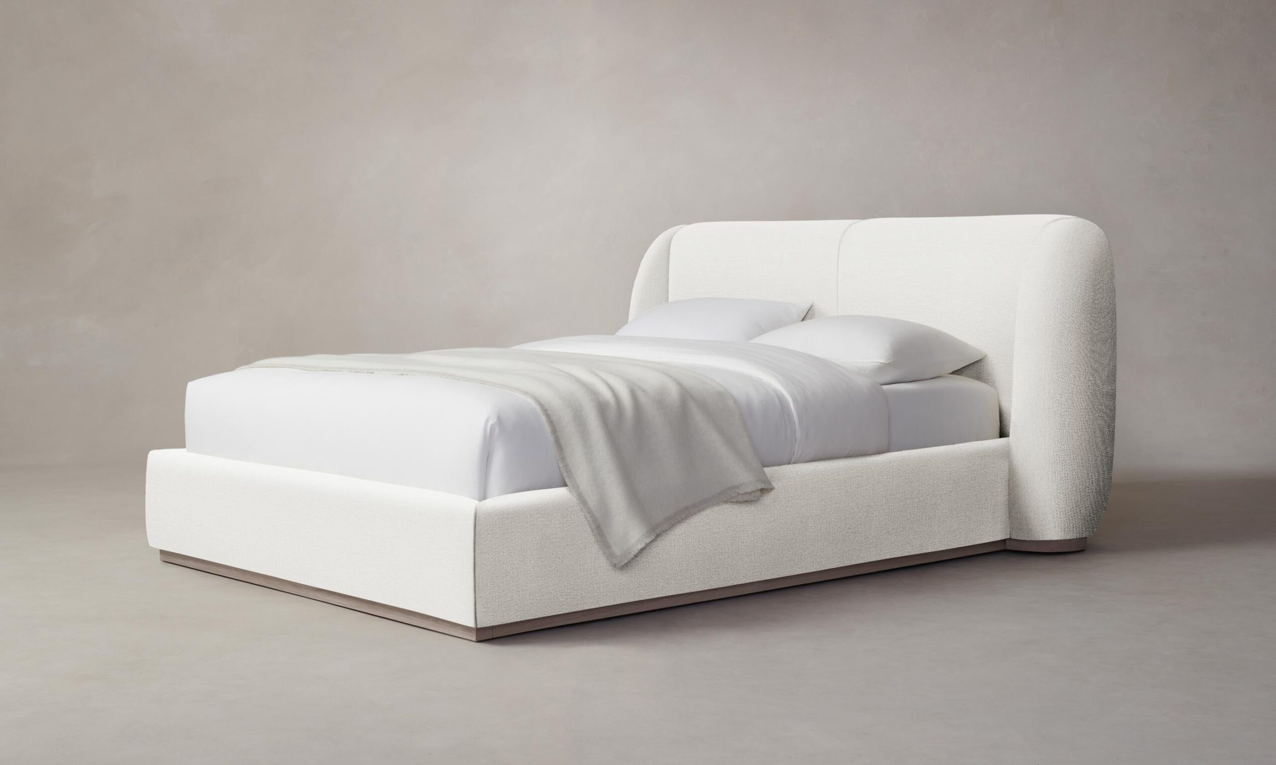 With its voluminous form and sweeping curves, the Smith bed is a statement piece for the bedroom. Its enveloping shelter headboard and frame are fully upholstered and set upon a plinth base.