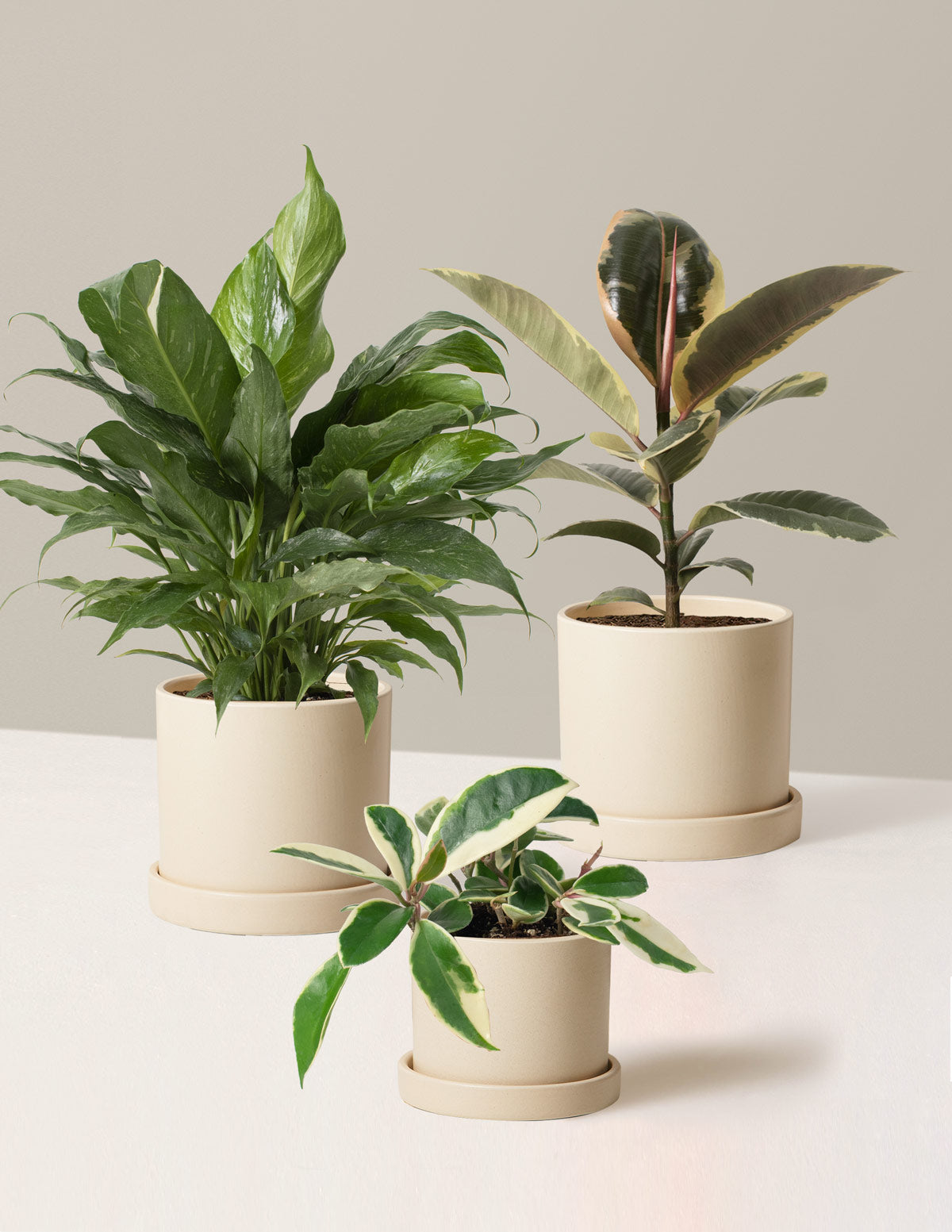 Our Spring bundle includes our medium Ficus Tineke, Peace Lily ‘Domino’ and small Hoya carnosa tricolor. These striking houseplants are low maintenance and have colors and textures that exude Spring vibes.