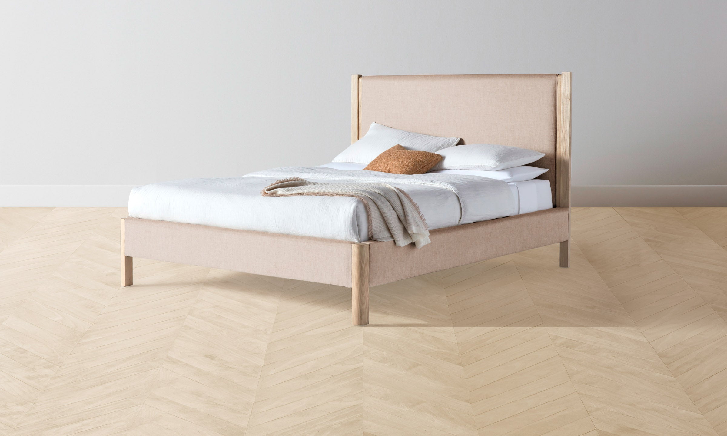 The Thompson bed is an expression of graceful simplicity. It has an ash frame with rounded corners and neat upholstery along the headboard, foot rail, and sides, creating a perfect balance of rigidity and softness.