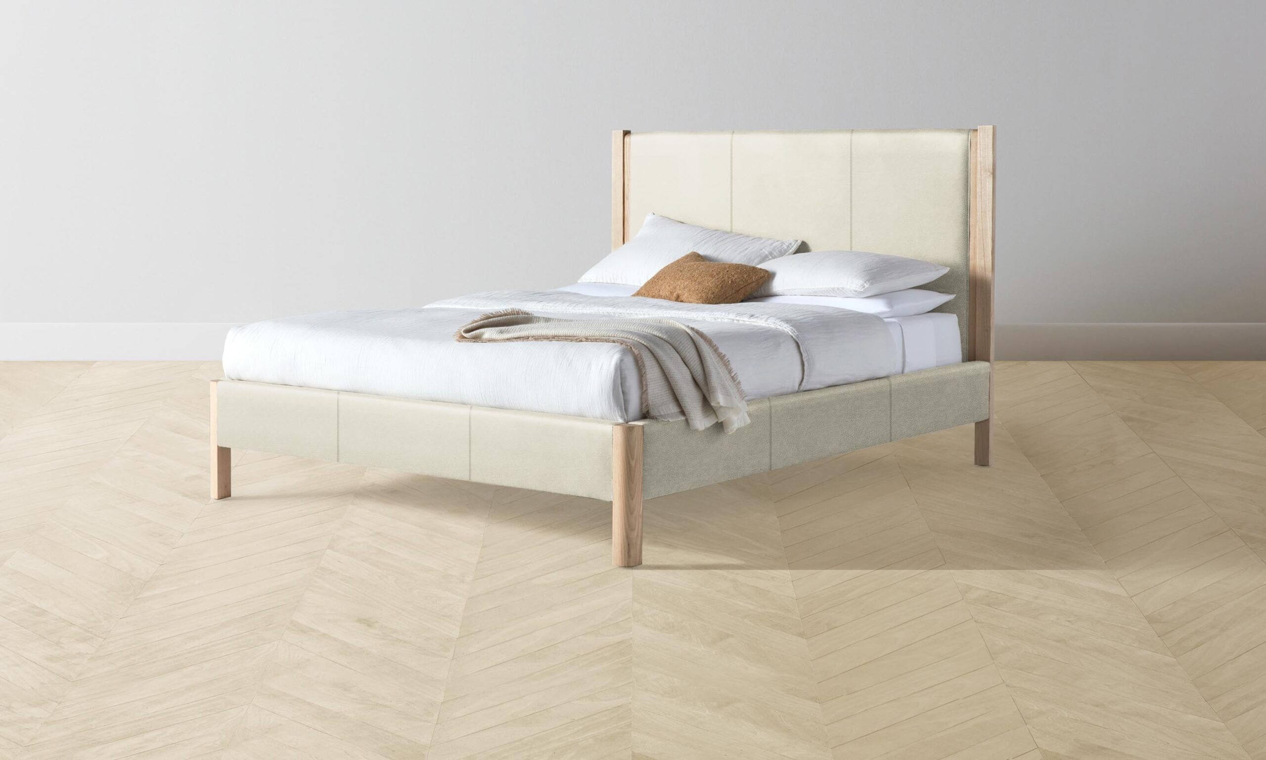 The Thompson bed is an expression of graceful simplicity. It has an ash frame with rounded corners and neat upholstery along the headboard, foot rail, and sides, creating a perfect balance of rigidity and softness.