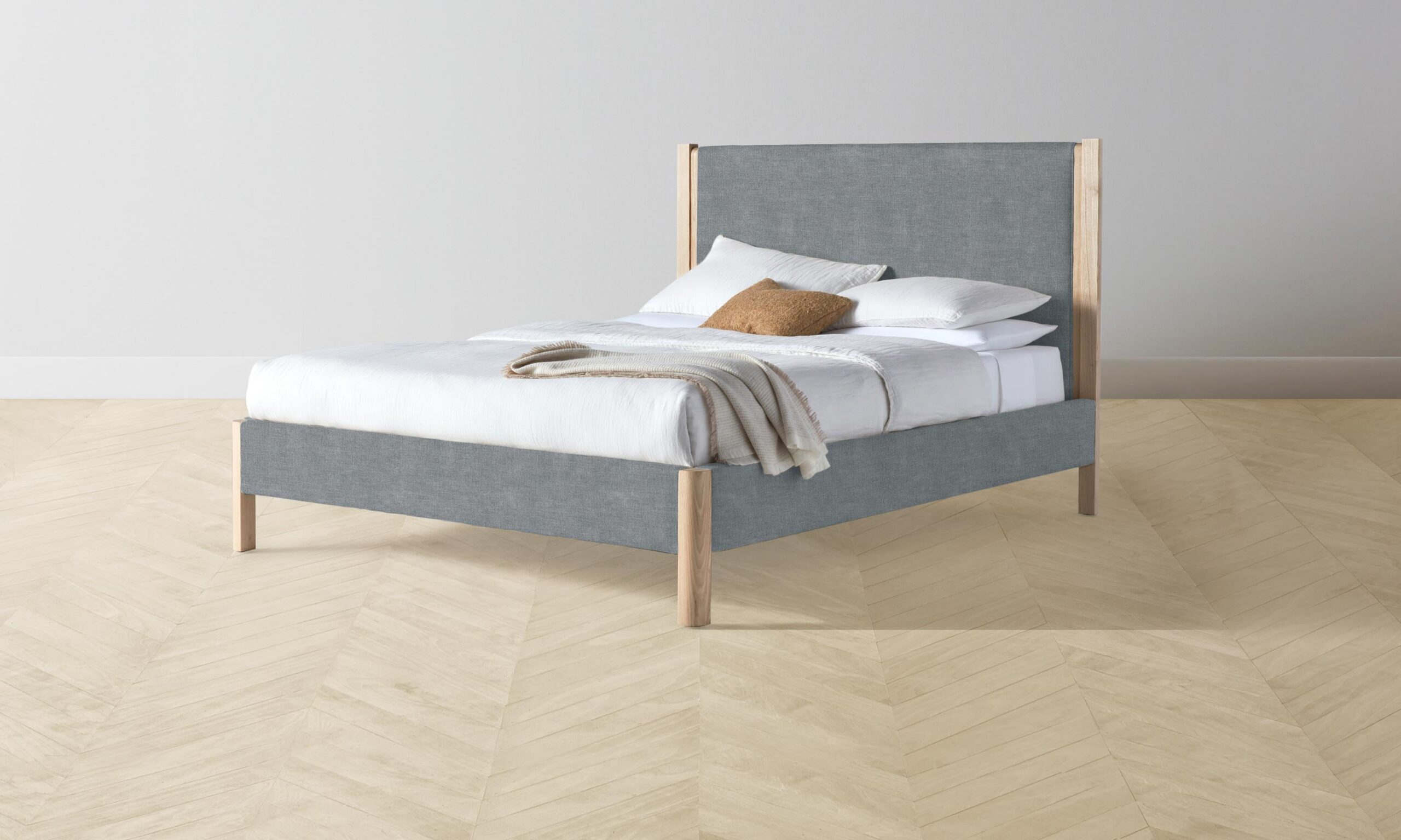The Thompson bed is an expression of graceful simplicity. It has an ash frame with rounded corners and neat upholstery along the headboard, foot rail, and sides, creating a perfect balance of rigidity and softness.
