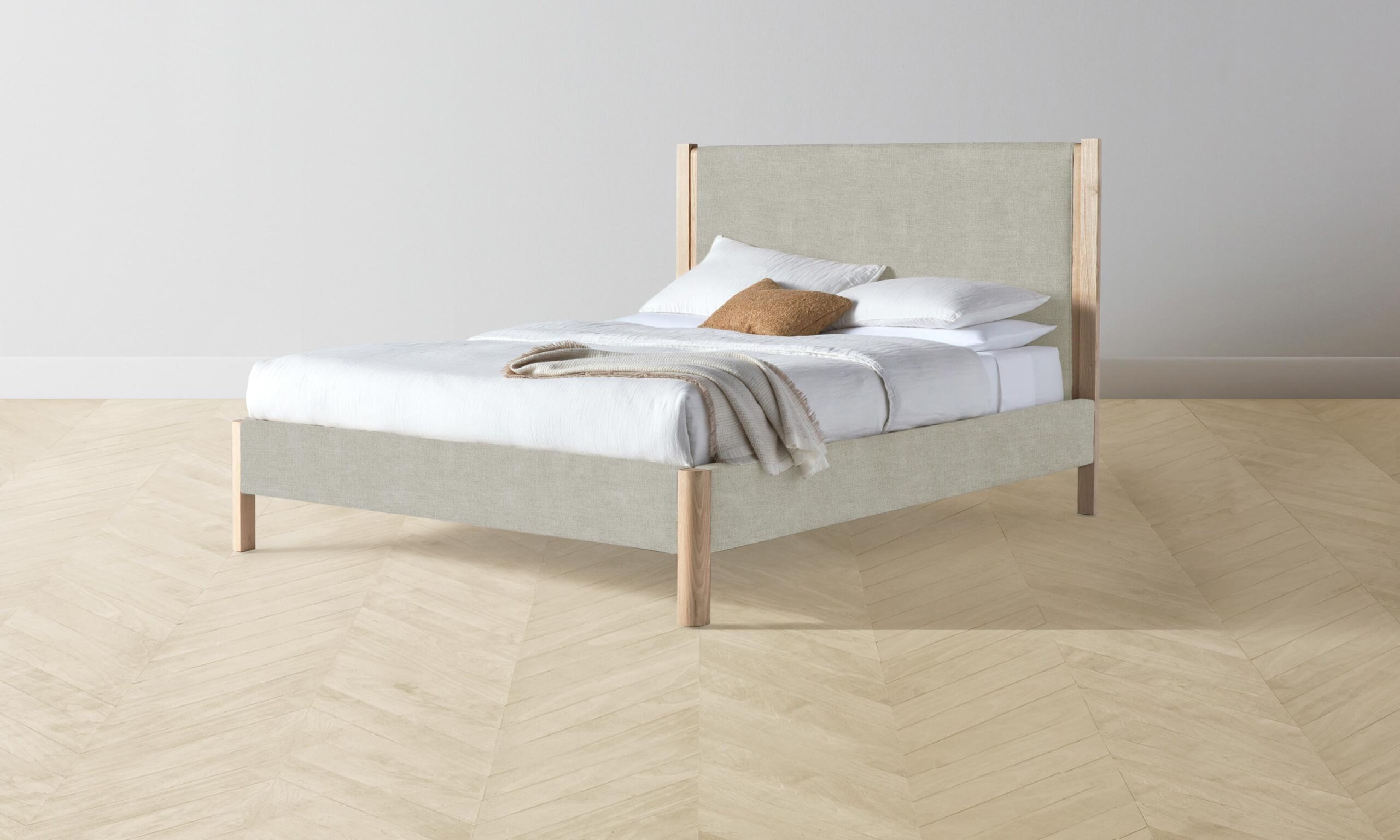 The Thompson bed is an expression of graceful simplicity. It has an ash frame with rounded corners and neat upholstery along the headboard, foot rail, and sides, creating a perfect balance of rigidity and softness.