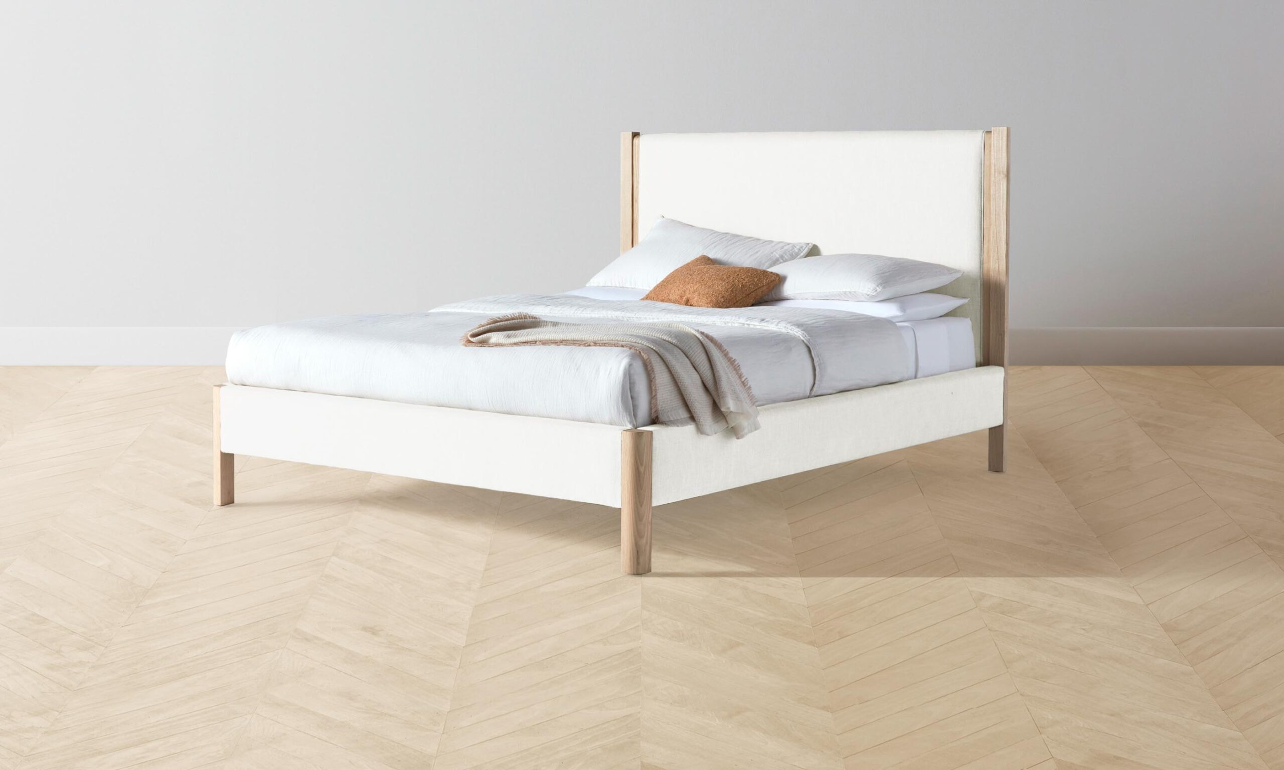 The Thompson bed is an expression of graceful simplicity. It has an ash frame with rounded corners and neat upholstery along the headboard, foot rail, and sides, creating a perfect balance of rigidity and softness.