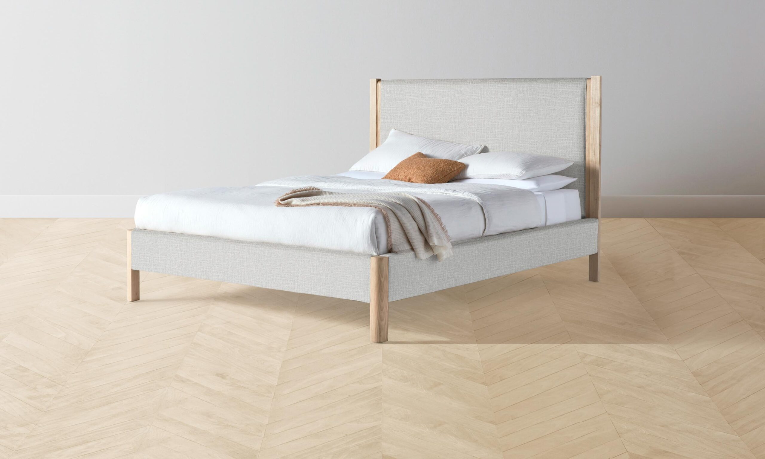 The Thompson bed is an expression of graceful simplicity. It has an ash frame with rounded corners and neat upholstery along the headboard, foot rail, and sides, creating a perfect balance of rigidity and softness.