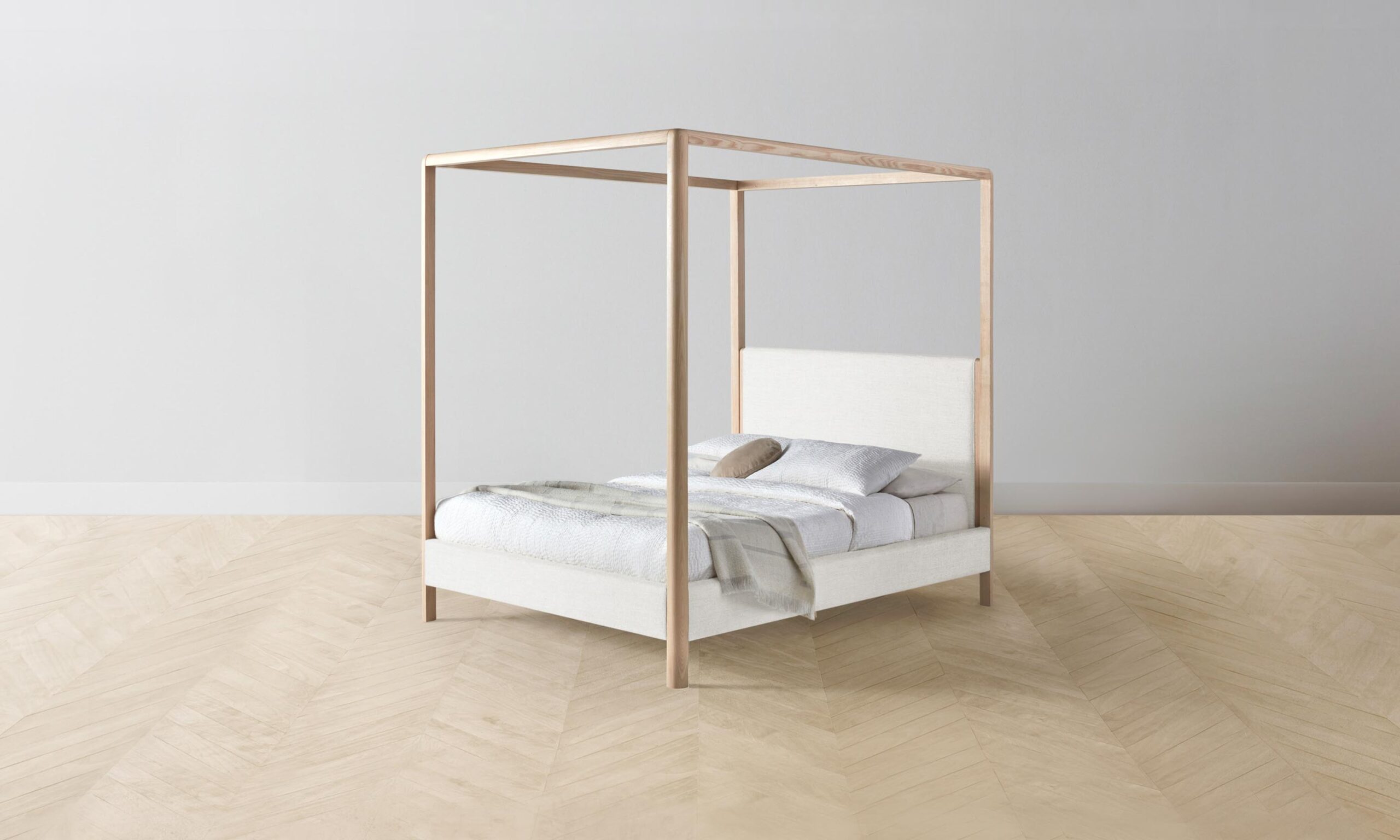 The Thompson canopy bed is an expression of graceful simplicity. It has an ash frame with rounded corners and neat upholstery along the headboard, foot rail, and sides, creating a perfect balance of rigidity and softness.