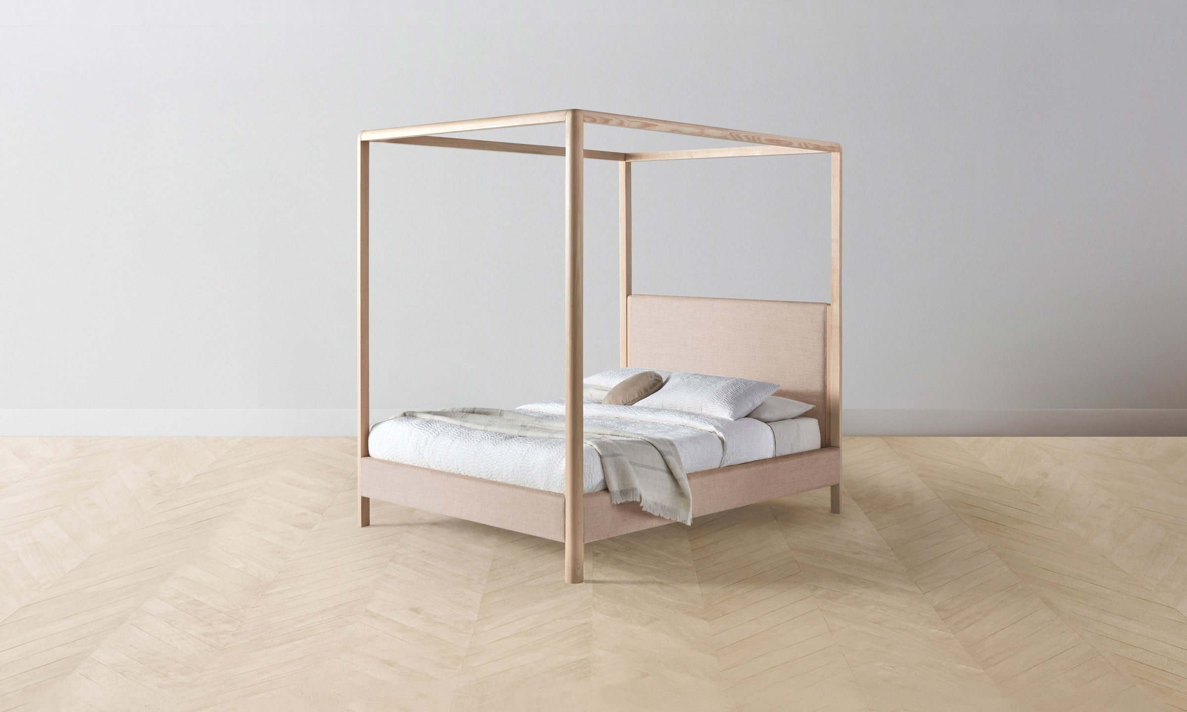 The Thompson canopy bed is an expression of graceful simplicity. It has an ash frame with rounded corners and neat upholstery along the headboard, foot rail, and sides, creating a perfect balance of rigidity and softness.