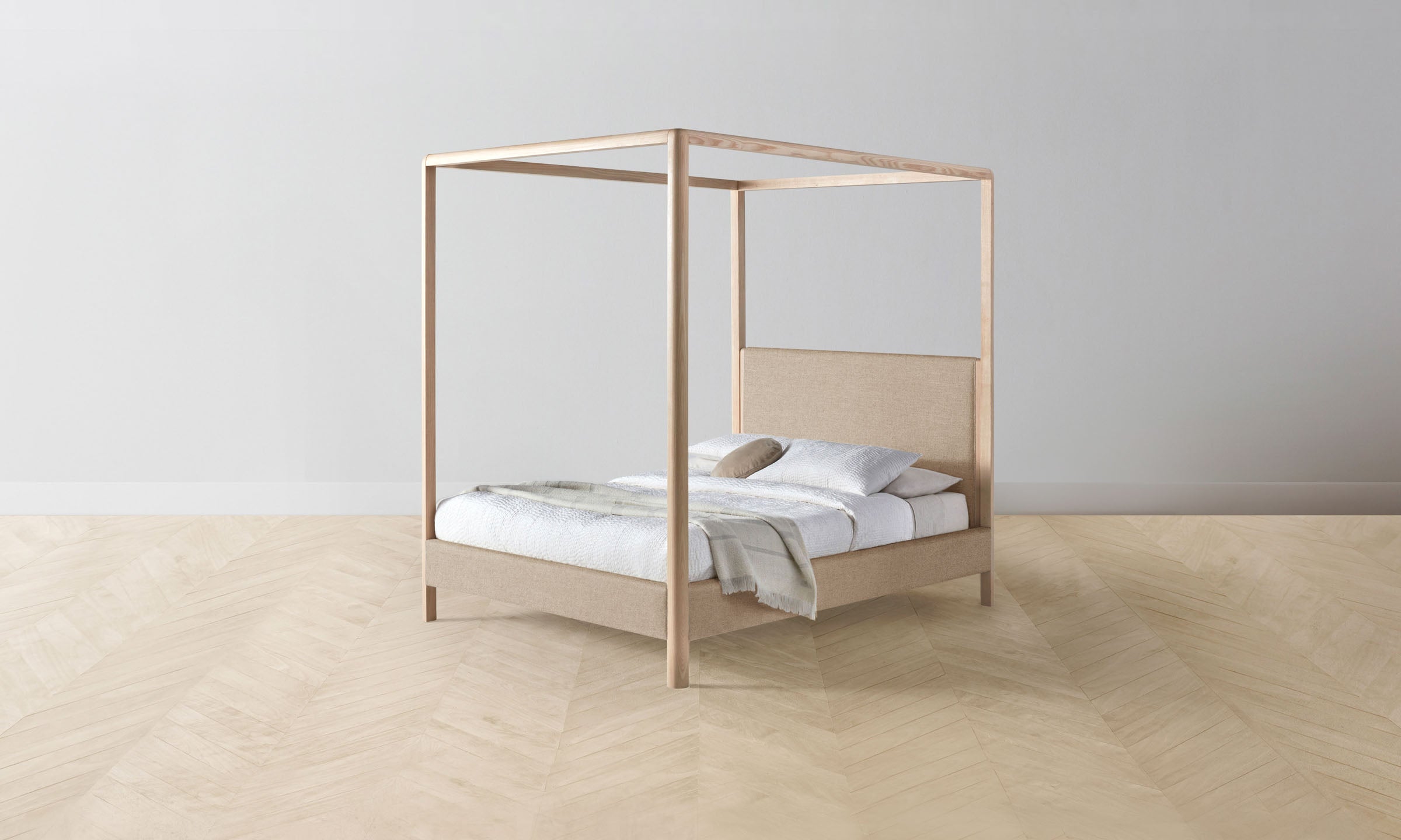 The Thompson canopy bed is an expression of graceful simplicity. It has an ash frame with rounded corners and neat upholstery along the headboard, foot rail, and sides, creating a perfect balance of rigidity and softness.
