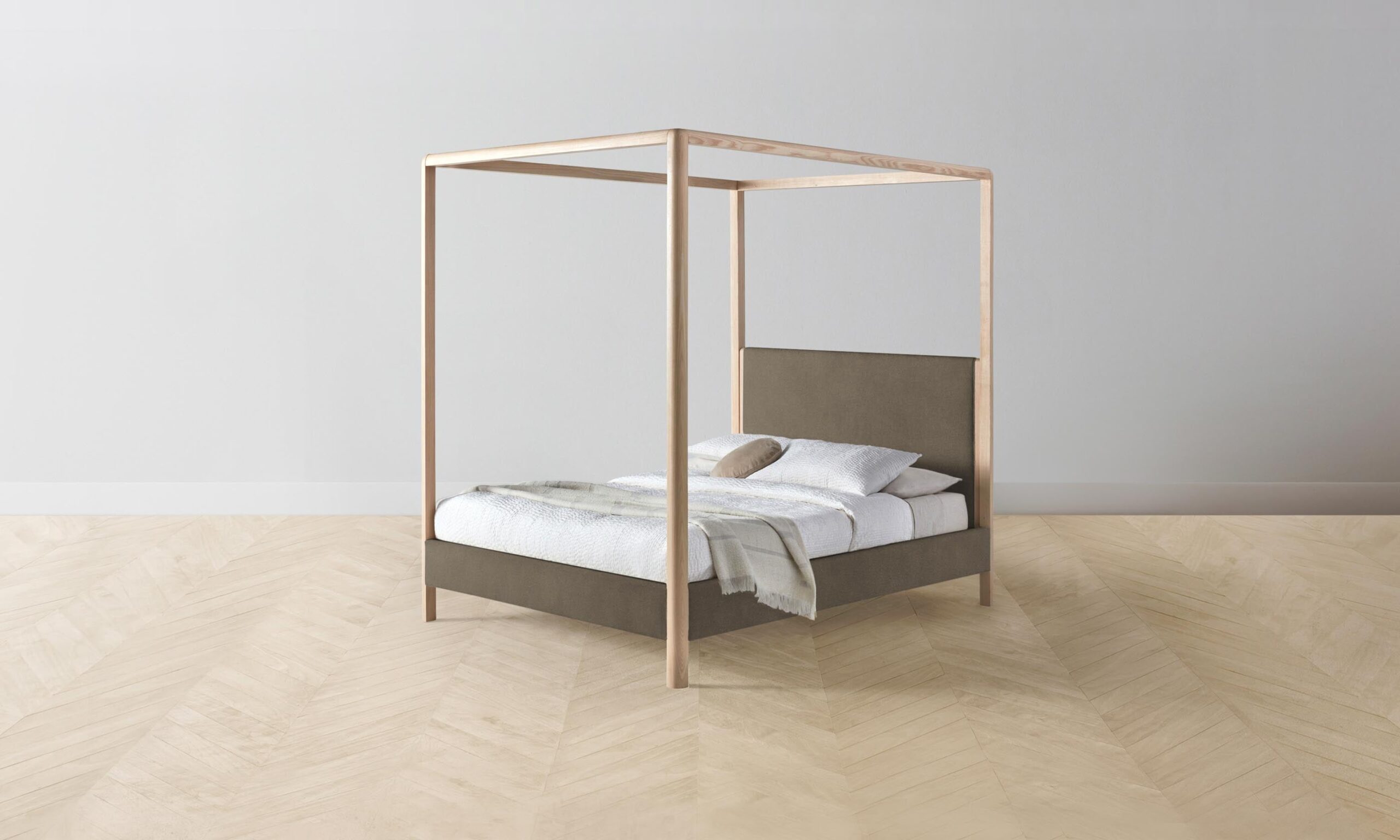 The Thompson canopy bed is an expression of graceful simplicity. It has an ash frame with rounded corners and neat upholstery along the headboard, foot rail, and sides, creating a perfect balance of rigidity and softness.