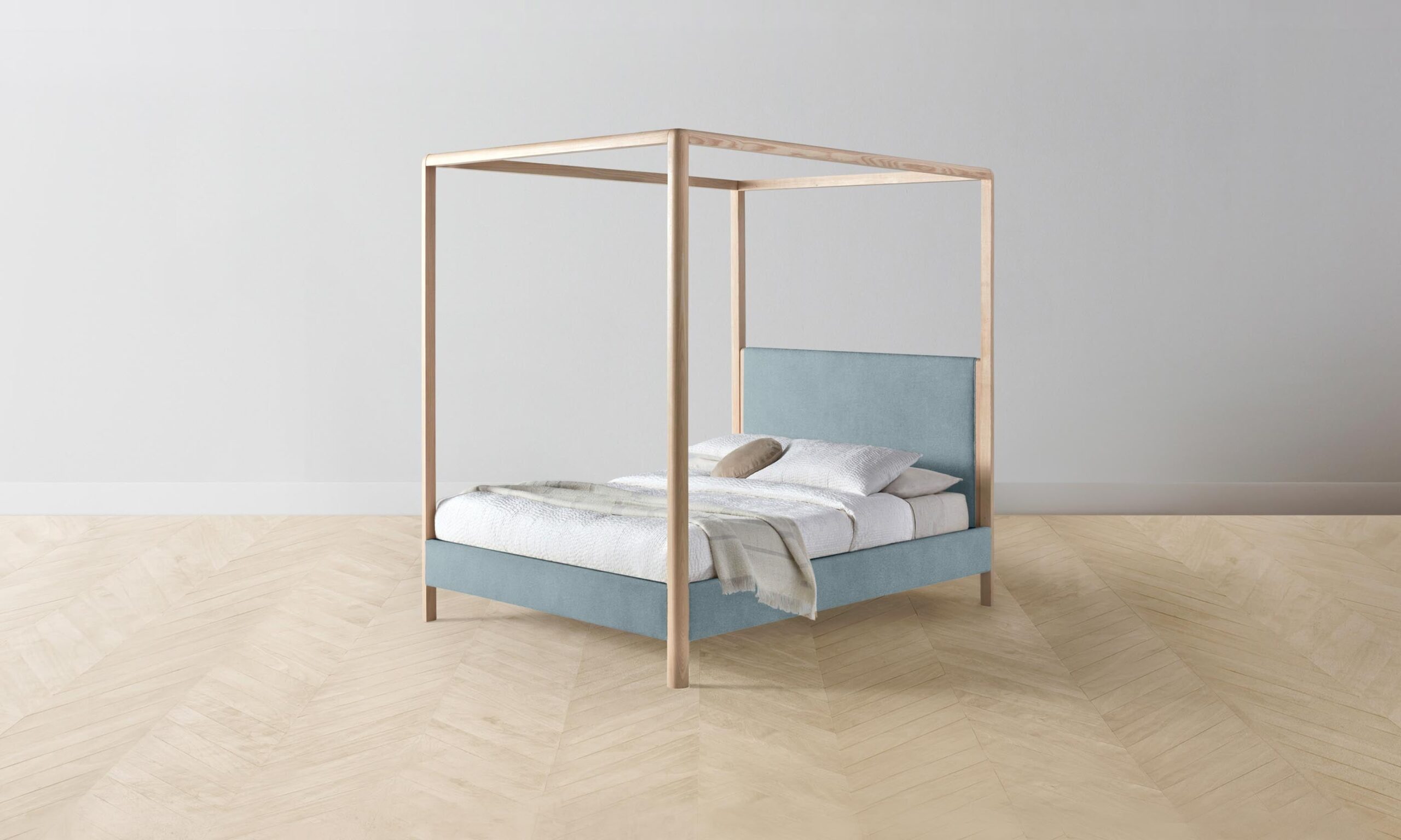 The Thompson canopy bed is an expression of graceful simplicity. It has an ash frame with rounded corners and neat upholstery along the headboard, foot rail, and sides, creating a perfect balance of rigidity and softness.