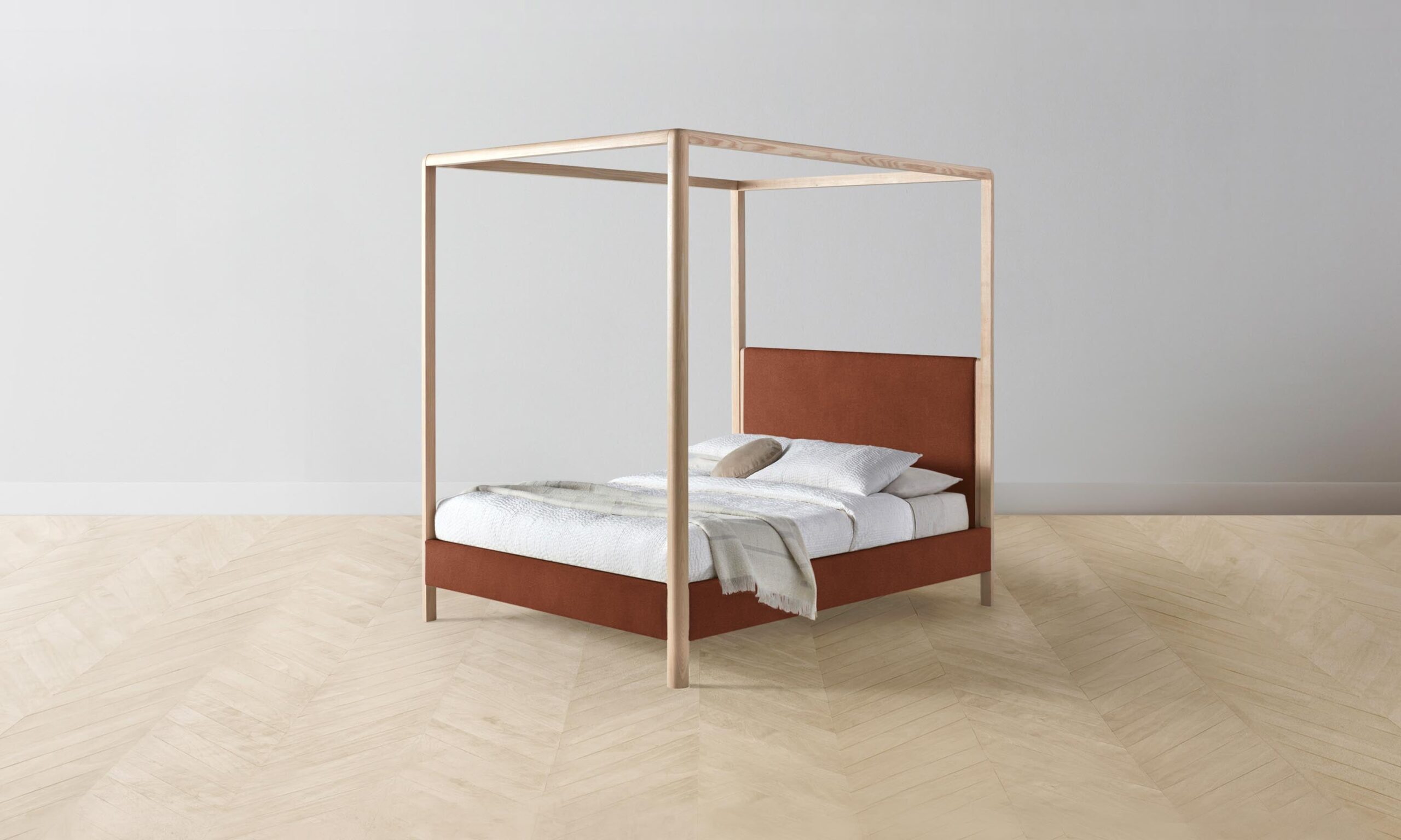 The Thompson canopy bed is an expression of graceful simplicity. It has an ash frame with rounded corners and neat upholstery along the headboard, foot rail, and sides, creating a perfect balance of rigidity and softness.