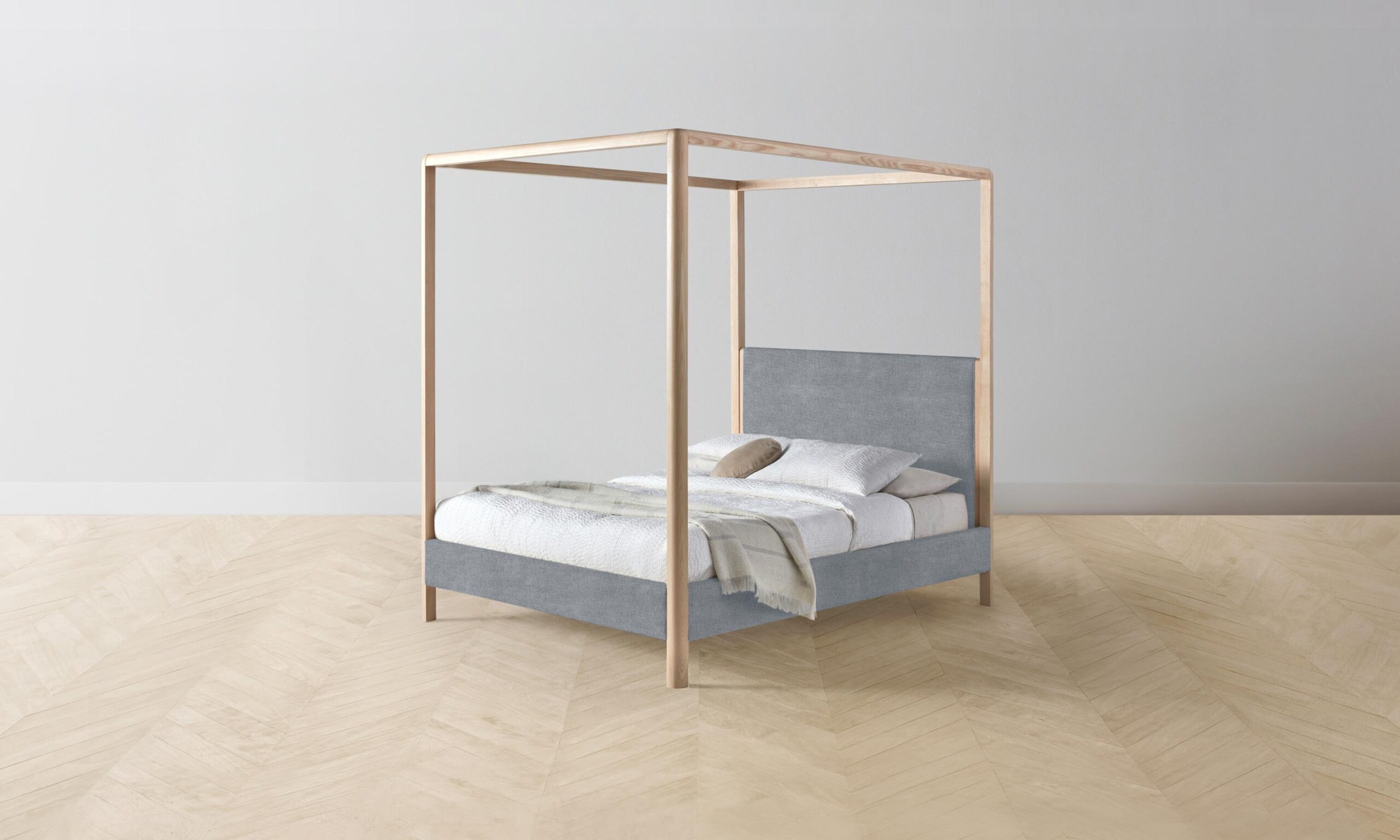 The Thompson canopy bed is an expression of graceful simplicity. It has an ash frame with rounded corners and neat upholstery along the headboard, foot rail, and sides, creating a perfect balance of rigidity and softness.