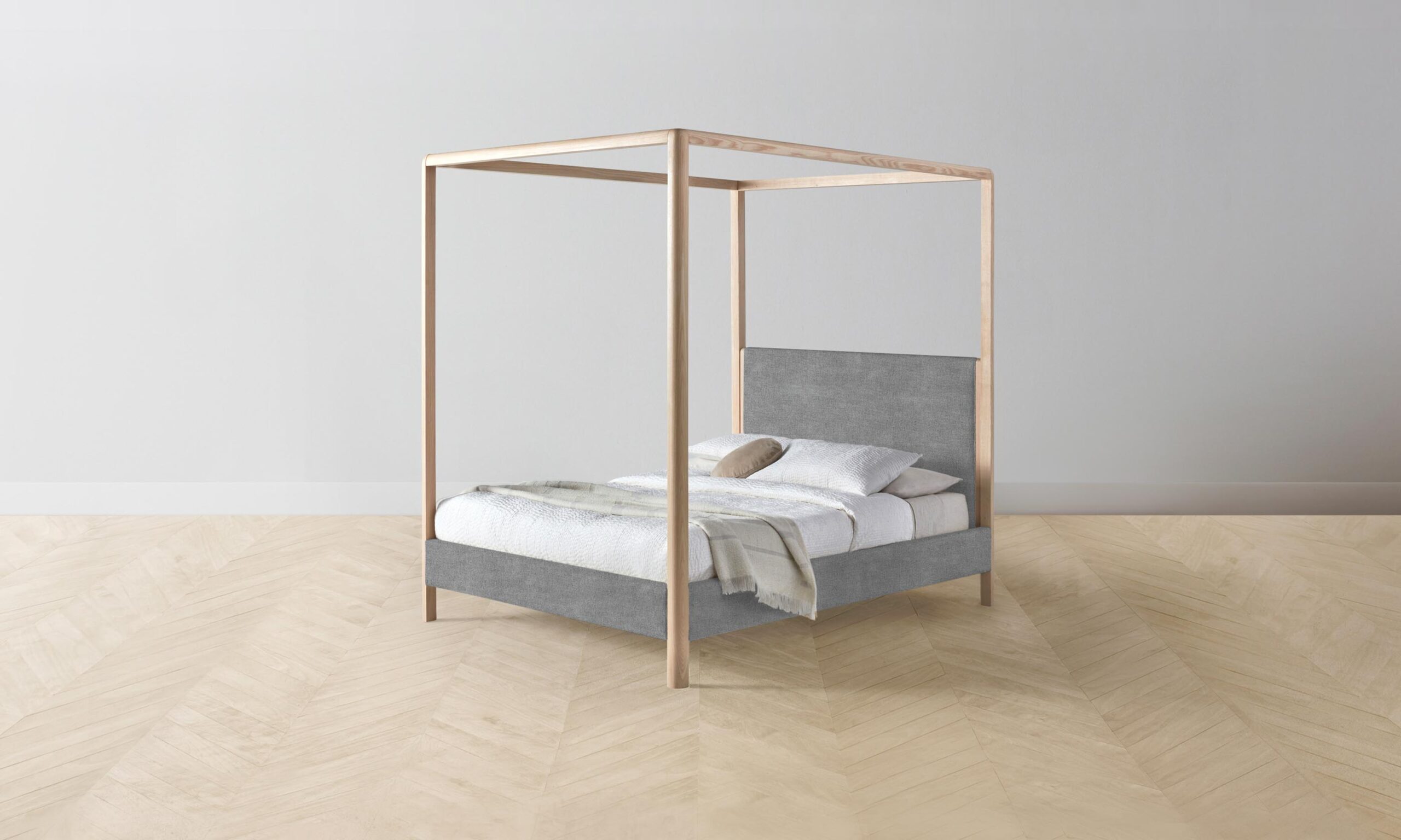 The Thompson canopy bed is an expression of graceful simplicity. It has an ash frame with rounded corners and neat upholstery along the headboard, foot rail, and sides, creating a perfect balance of rigidity and softness.