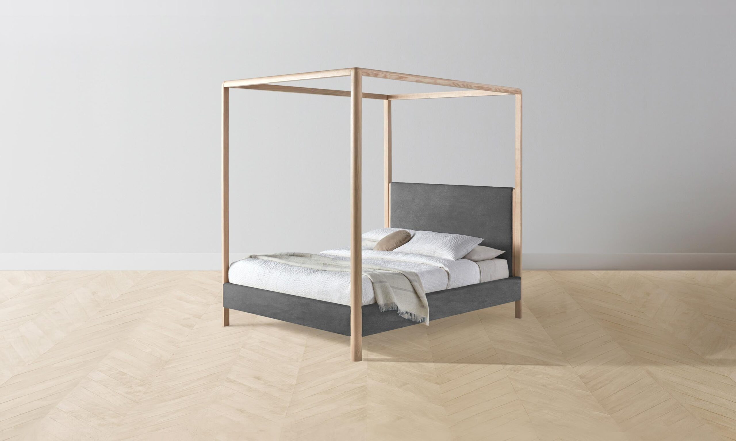 The Thompson canopy bed is an expression of graceful simplicity. It has an ash frame with rounded corners and neat upholstery along the headboard, foot rail, and sides, creating a perfect balance of rigidity and softness.