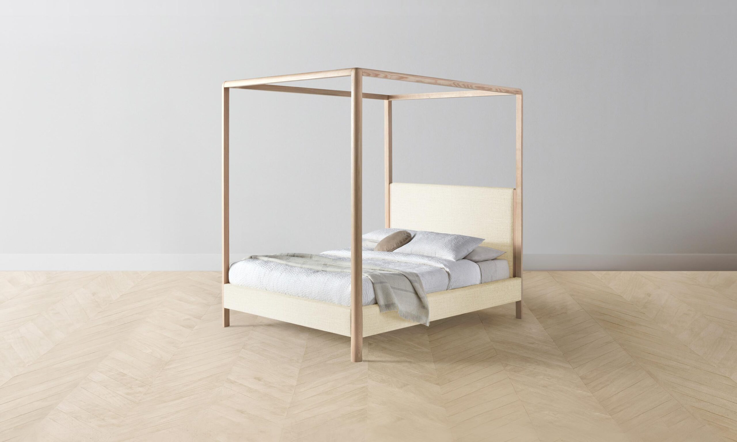 The Thompson canopy bed is an expression of graceful simplicity. It has an ash frame with rounded corners and neat upholstery along the headboard, foot rail, and sides, creating a perfect balance of rigidity and softness.