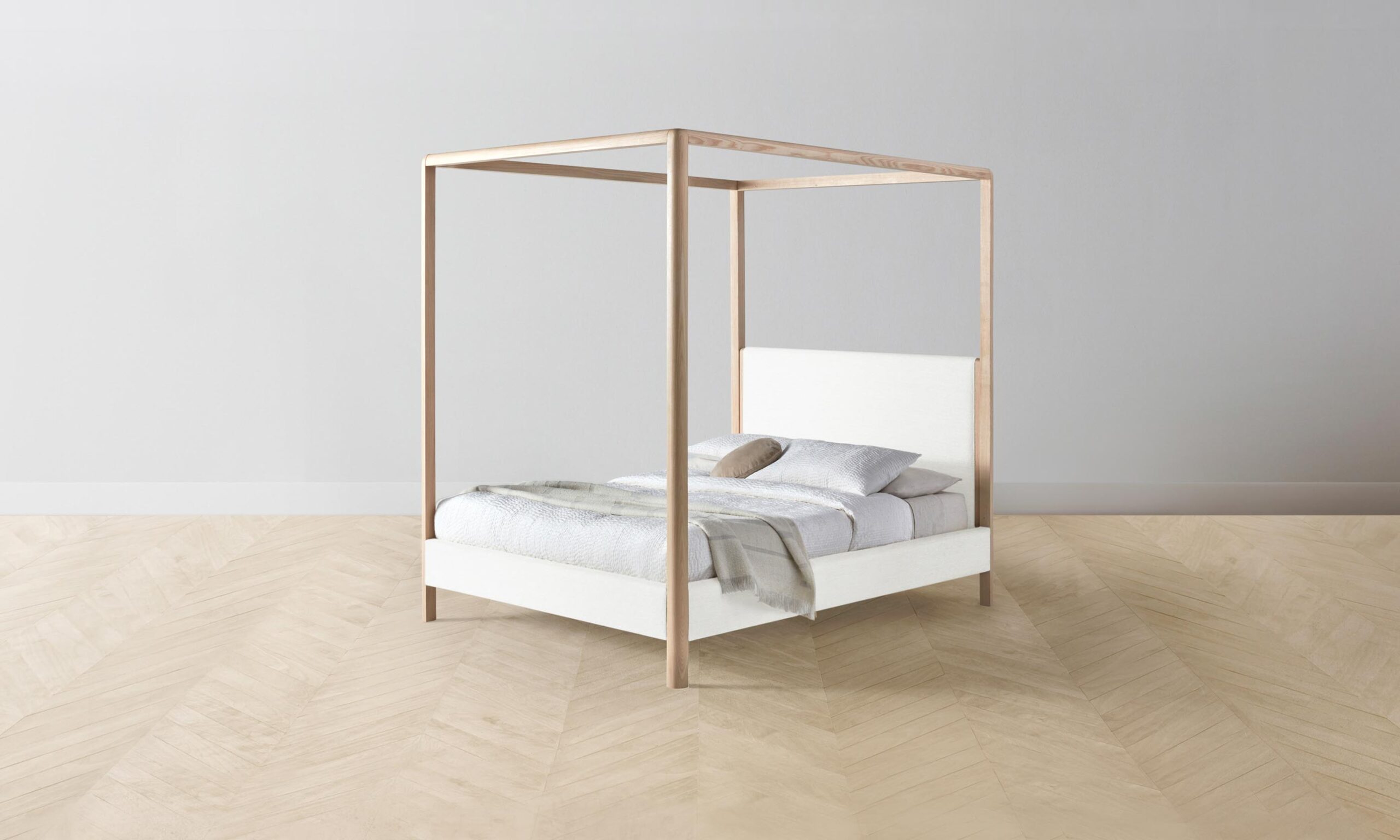 The Thompson canopy bed is an expression of graceful simplicity. It has an ash frame with rounded corners and neat upholstery along the headboard, foot rail, and sides, creating a perfect balance of rigidity and softness.