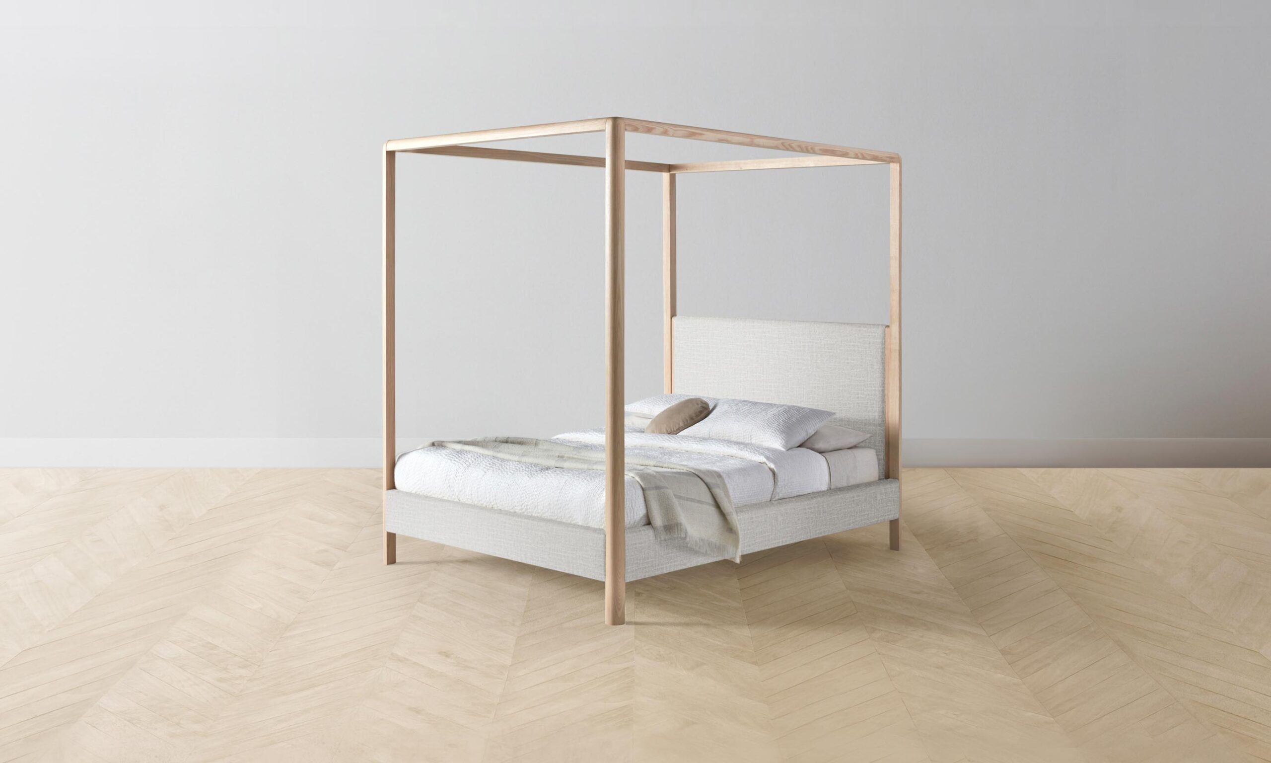 The Thompson canopy bed is an expression of graceful simplicity. It has an ash frame with rounded corners and neat upholstery along the headboard, foot rail, and sides, creating a perfect balance of rigidity and softness.
