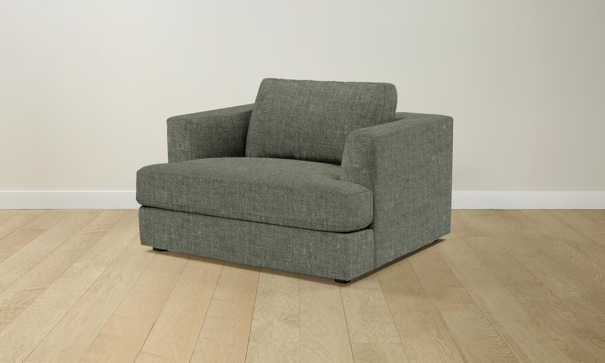 With bold proportions and a low-lying silhouette, the Varick chair-and-a-half makes a contemporary statement. Its generous arms and deep seat envelop the body, while impeccable upholstery offers a sleek finish.