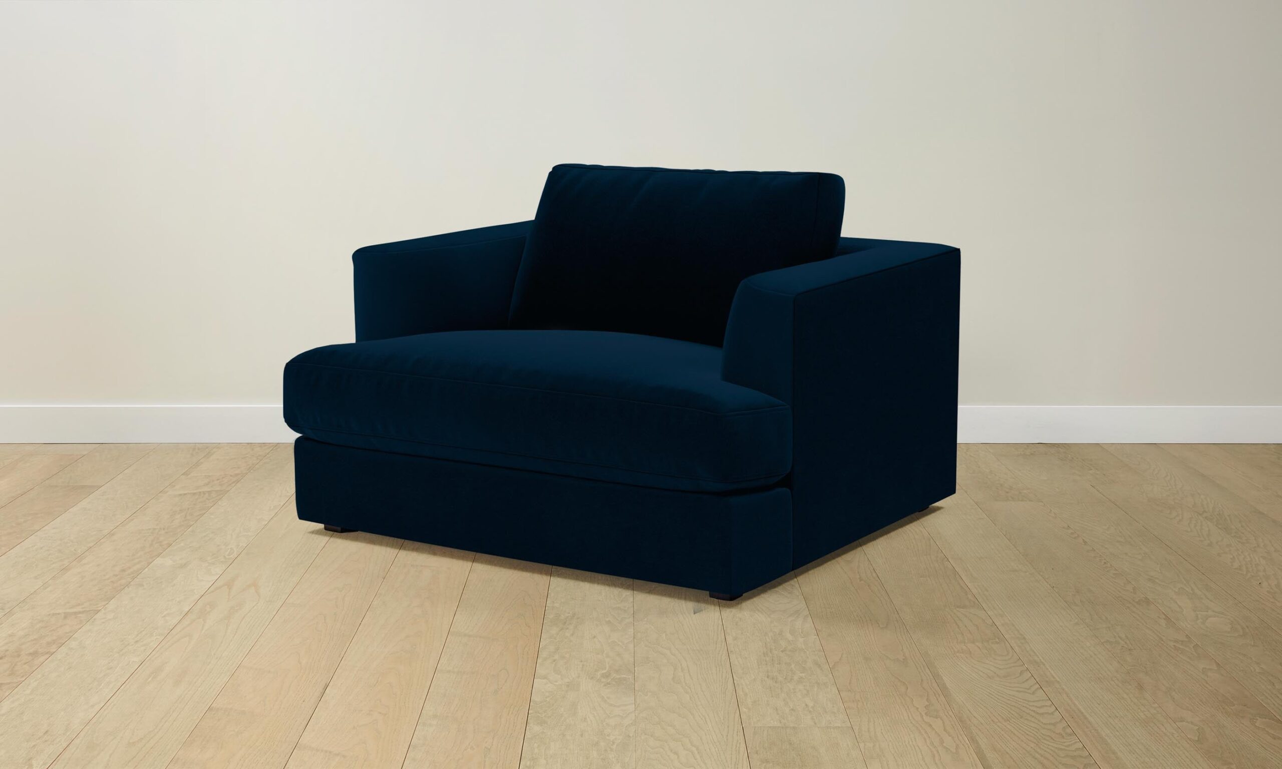 With bold proportions and a low-lying silhouette, the Varick chair-and-a-half makes a contemporary statement. Its generous arms and deep seat envelop the body, while impeccable upholstery offers a sleek finish.