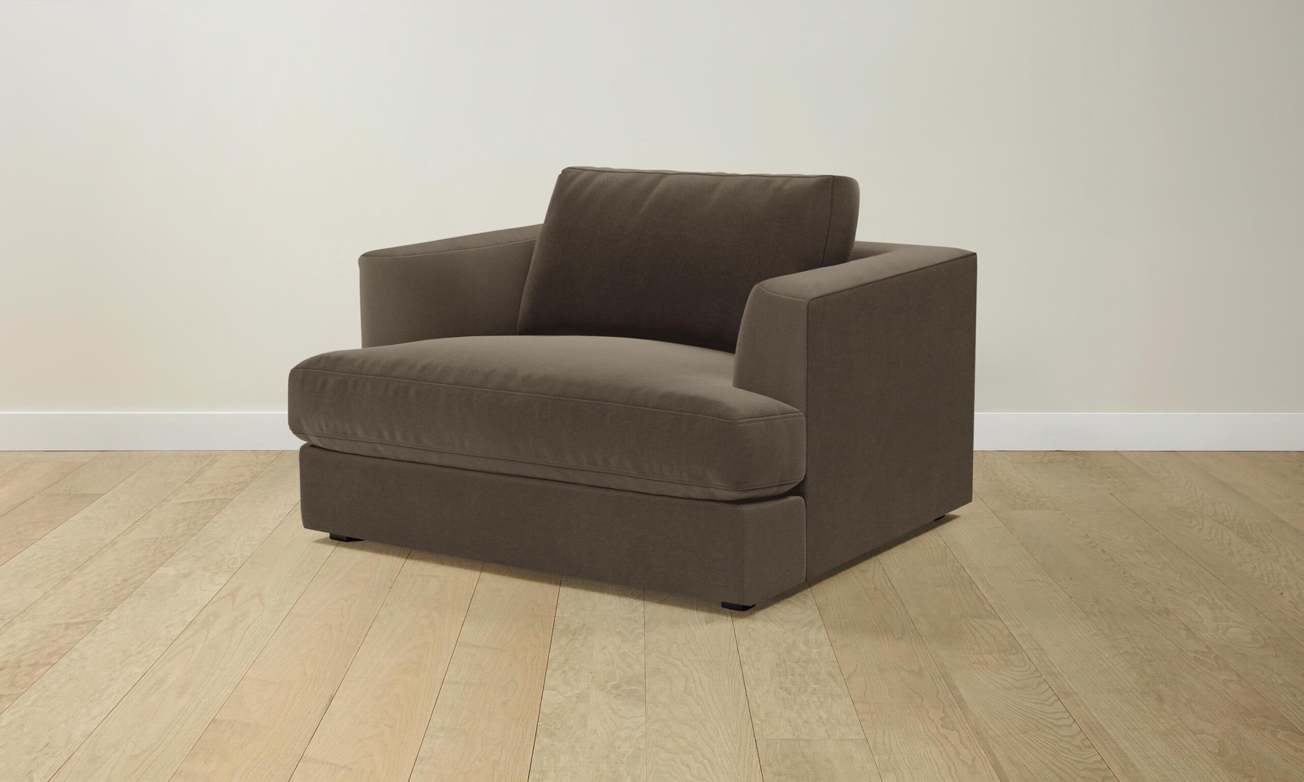 With bold proportions and a low-lying silhouette, the Varick chair-and-a-half makes a contemporary statement. Its generous arms and deep seat envelop the body, while impeccable upholstery offers a sleek finish.