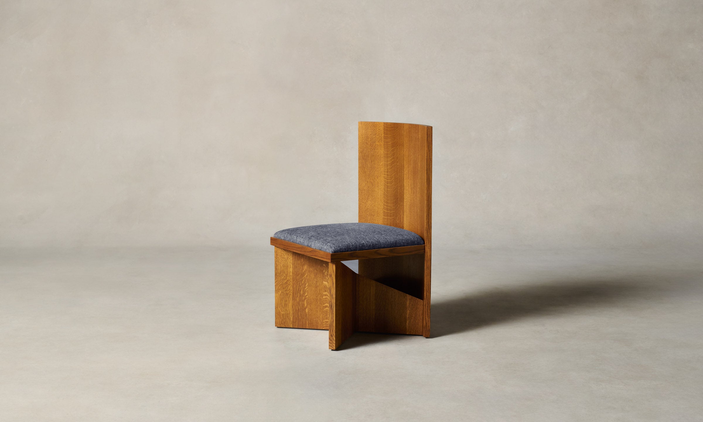 The Venice chair is a study in contrasts. The softness of its curved back and upholstered seat is balanced by its angular base, where a void welcomes conversation between light and shadow.