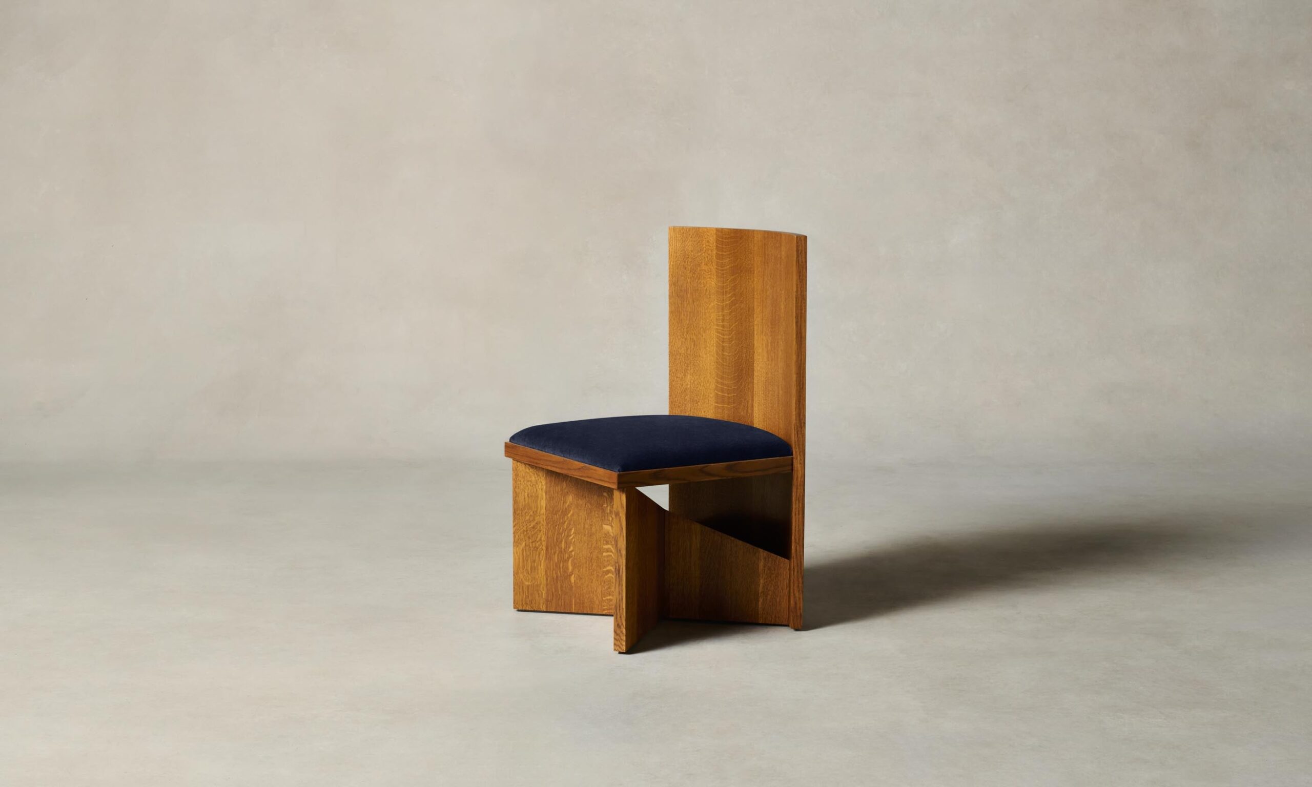 The Venice chair is a study in contrasts. The softness of its curved back and upholstered seat is balanced by its angular base, where a void welcomes conversation between light and shadow.